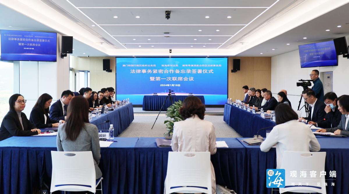 1月18日,澳门特别行政区政府法务局、横琴粤澳深度合作区法律事务局、珠海市司法局在琴澳国际法务集聚区签署法律事务紧密合作备忘录。当日同时召开珠琴澳法律部门第一次联席会议,三方就加强法律事务合作进行了深入讨论和交流。