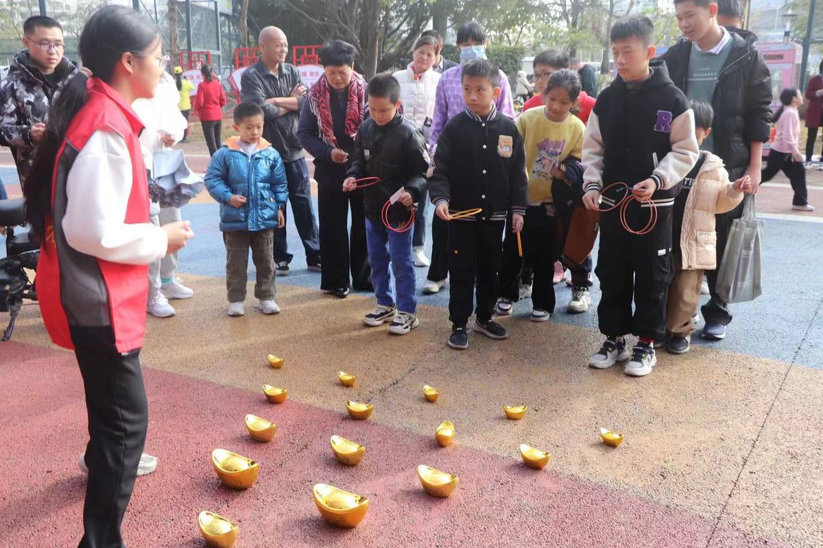 红彤彤的大灯笼下挂着一条条谜语,人见人爱的财神爷爷来拜大年,一个个的“金元宝”等着你来套……1月28日,梅华街道上冲社区公园小广场上喜气洋洋,充满节日气氛,一场主题为“党群同乐心连心 龙马精神贺新春”的迎新春游园活动在此欢乐举行,吸引了300余名外来务工人员及社区居民前来游玩。