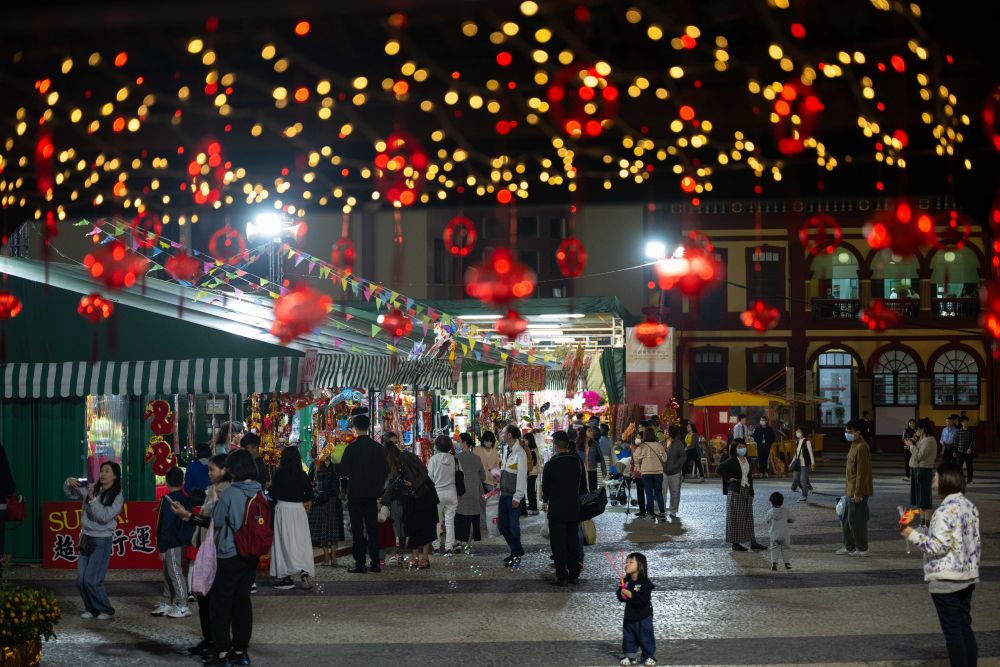 为增加新春节日气氛,澳门特区政府市政署在塔石广场举办2024年度农历春节年宵市场,并分别在澳门半岛及氹仔设置爆竹燃放区与大家一起迎新岁、贺新禧。年宵市场现场设有20个售卖贺年礼品摊档、6个售卖年花摊档及4个售卖小食摊档。