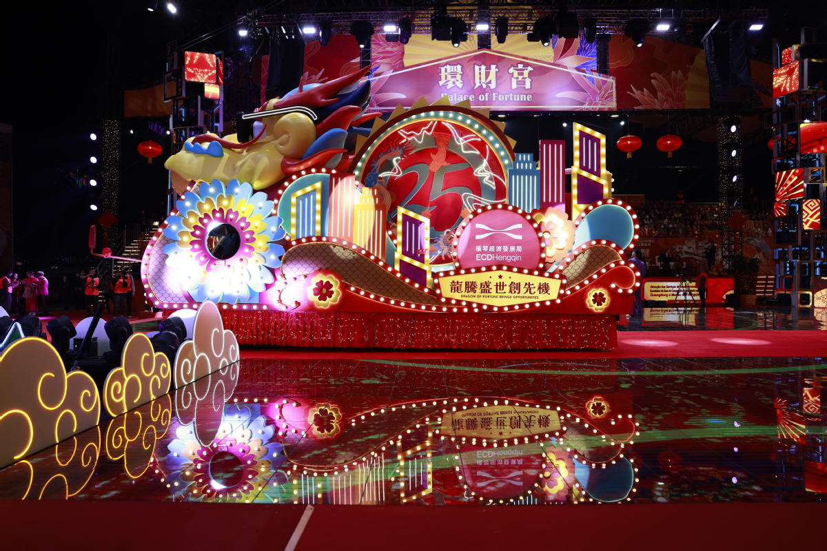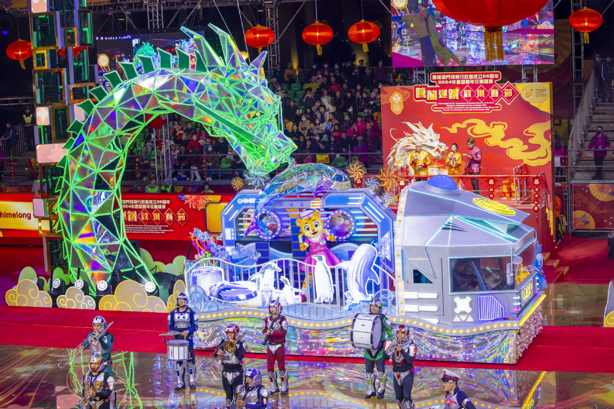 2月12日(大年初三)晚,横琴粤澳深度合作区经济发展局动员长隆集团,一同参与澳门“2024年农历新年花车汇演”活动,派出两辆贺岁花车与市民游客共迎活力龙年。