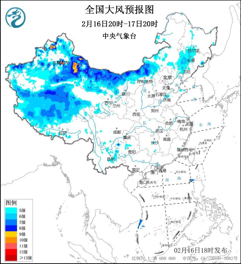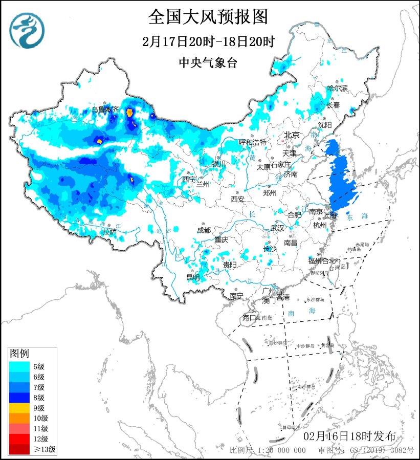 2月17日20时至18日20时,新疆北疆东部和南疆盆地、内蒙古西部、青海西南部、西藏西部、甘肃西部等地将有5~7级、阵风8~9级的大风,新疆山口地区风力可达10级,阵风12~13级;黄海大部海域、东海北部海域将有7级、阵风8~9级的大风。