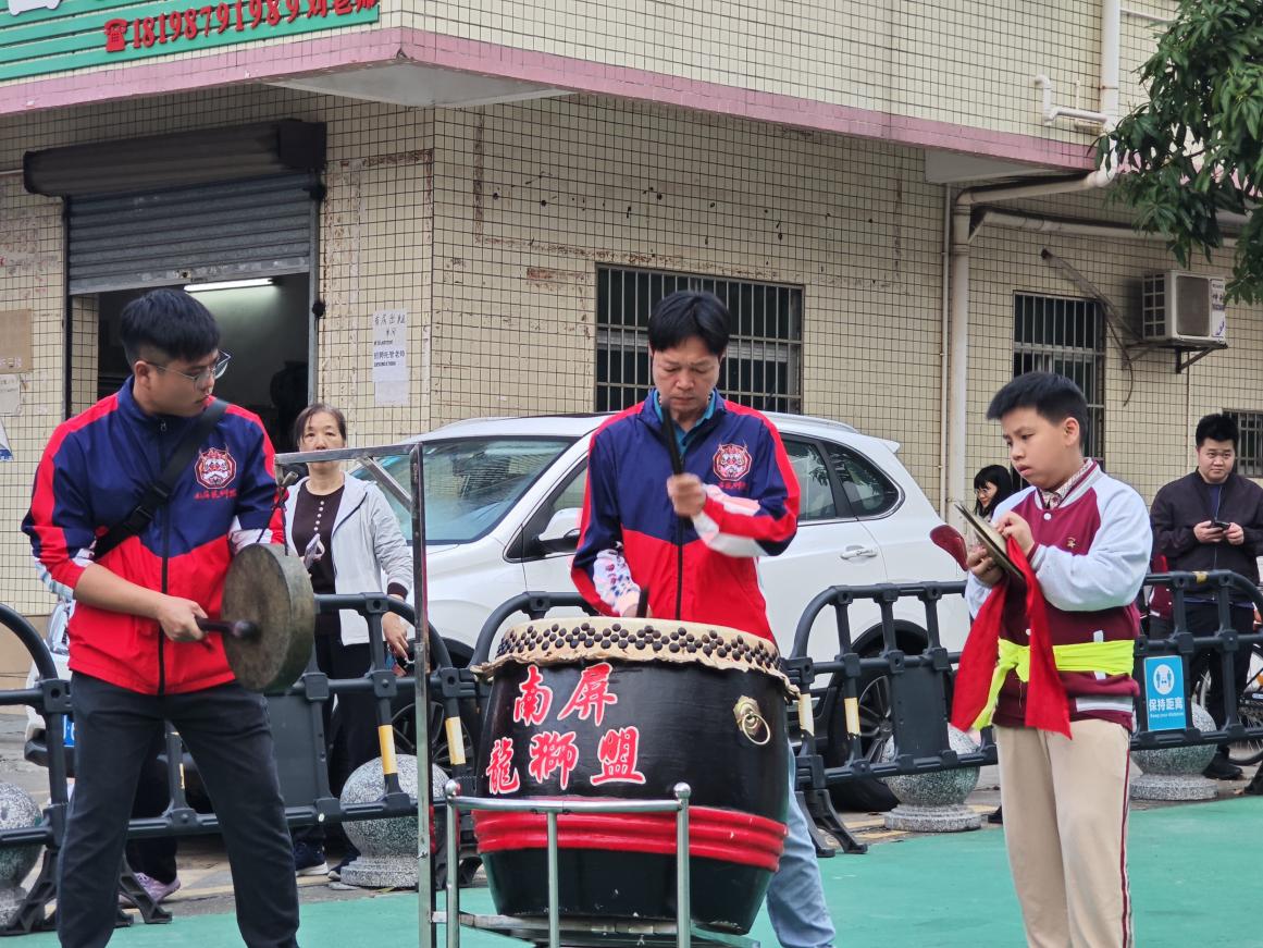 狮队中舞动狮头同时穿插做鼓手的是五2班伍昕然同学的爸爸,他是醒狮队队长。镲手是五4班罗志潮的爸爸。2个孩子以及小队员杨吉祥、梁俊轩等广昌学生,平常利用周末时间参与醒狮传统文化学习和训练。