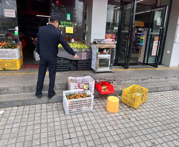 近日,红旗镇执法人员在日常巡查中发现,矿山一路某水果店擅自占用人行横道,超出范围经营,门前及人行道树下堆满篮筐,果皮污渍随处可见。