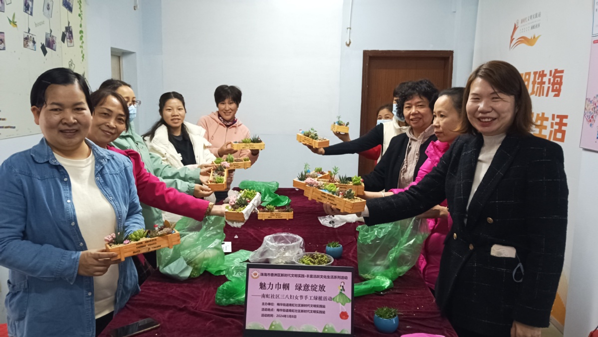 3月8日,一场主题为“魅力巾帼 绿意绽放”手工绿植活动在南虹社区新时代文明实践站举行,活动由梅华街道南虹社区党委、南虹社区妇联、珠海市耆康社会工作服务中心联合主办,巾帼志愿者和社区单亲妈妈15人参加活动。