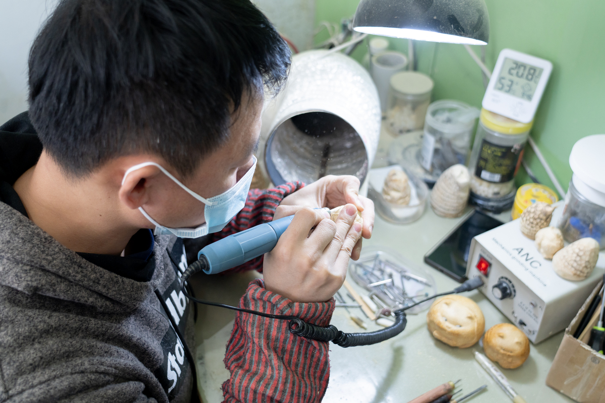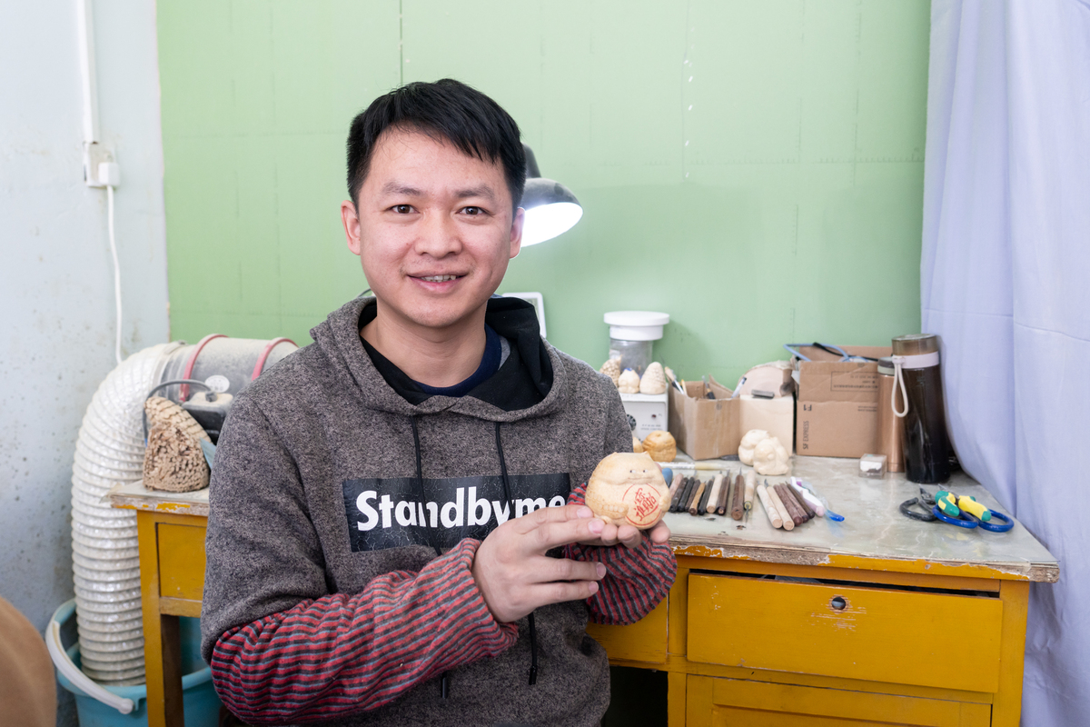 在黑河市益民小区,郜周强的工作室里粉末横飞。郜周强是黑河市张地营子乡大新屯村人,雕刻艺术是郜周强2008年南下浙江习得,自此便走上了雕刻之路。
