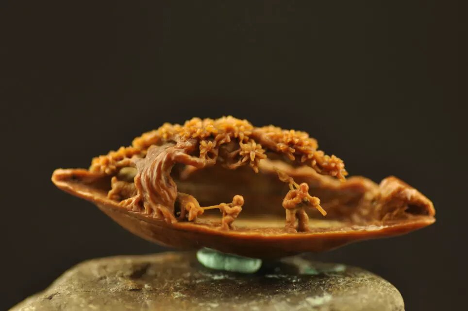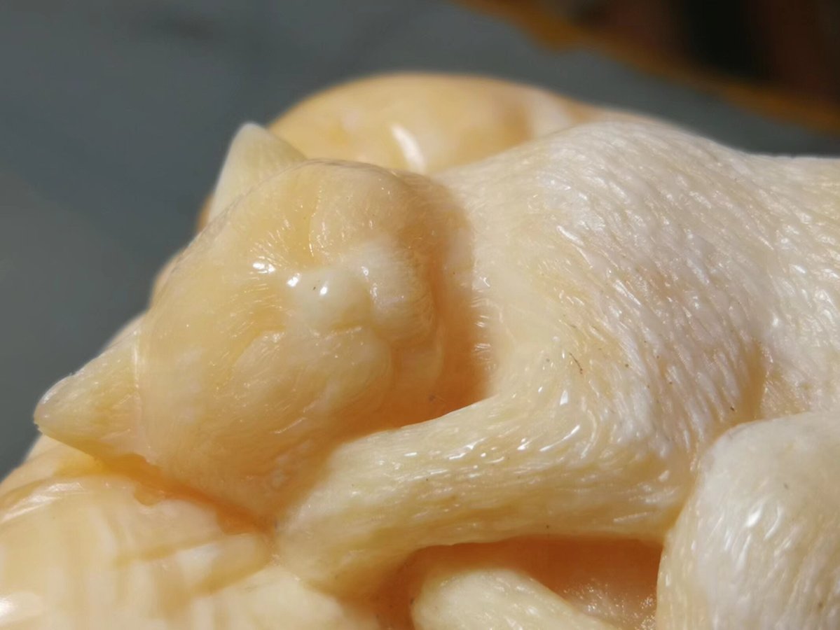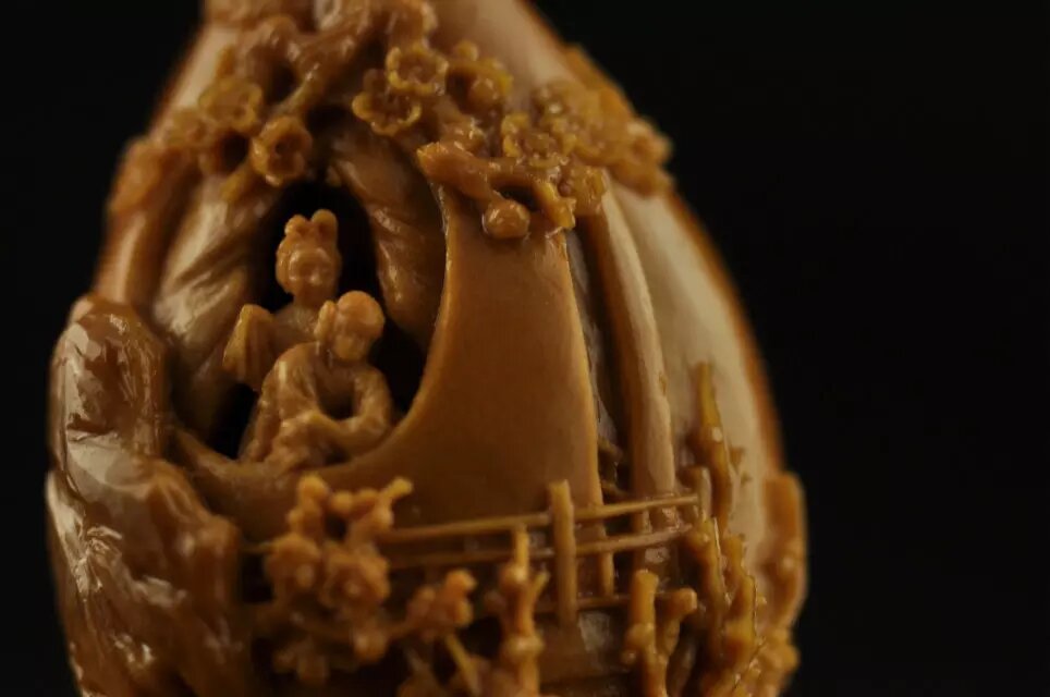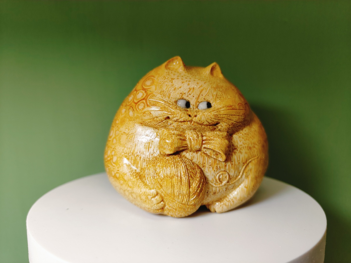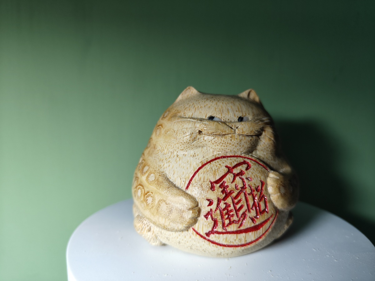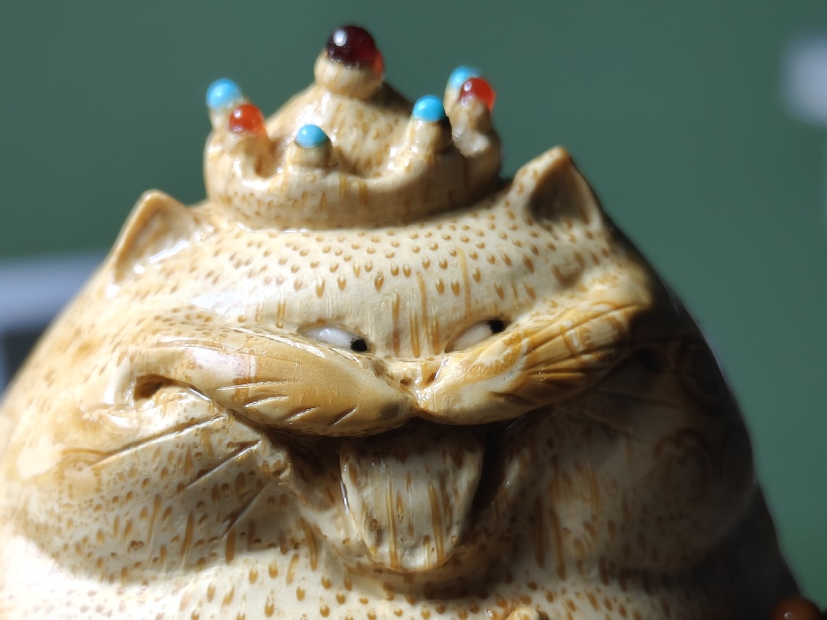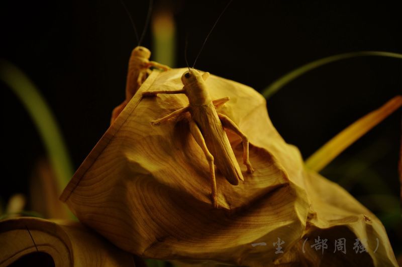 他的雕刻作品神形兼备,大多伴有吉祥的寓意且贴近人们的日常生活。金蟾、猫、蚂蚱等形象憨态可掬、栩栩如生。