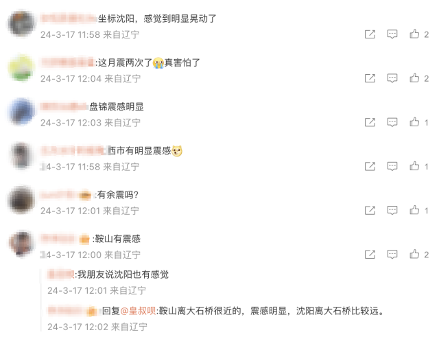 地震发生后,辽宁多地网友表示,沈阳、鞍山、盘锦等地均有震感。