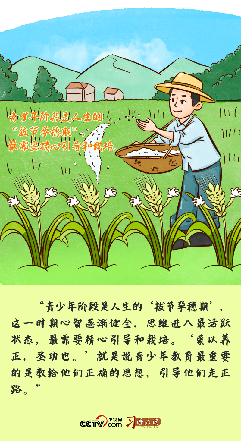 “拔节孕穗期”是禾谷类作物汲取养分、生长发育最快的阶段,也是决定这一年收成多少的重要时期,需要农人精心照料。处在人生“拔节孕穗期”的青少年阶段,也是一个人一生中世界观、人生观、价值观打底塑形的关键时期,正确的引导和悉心栽培至关重要。