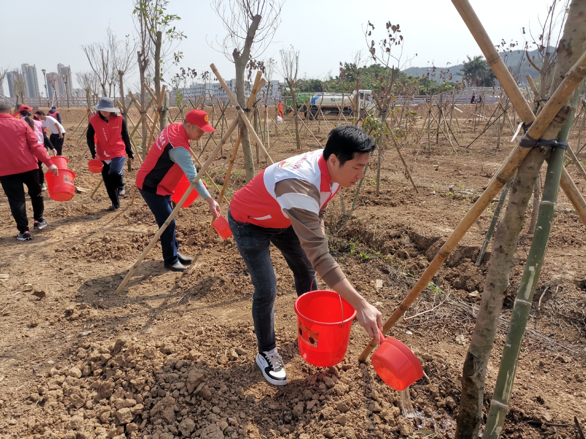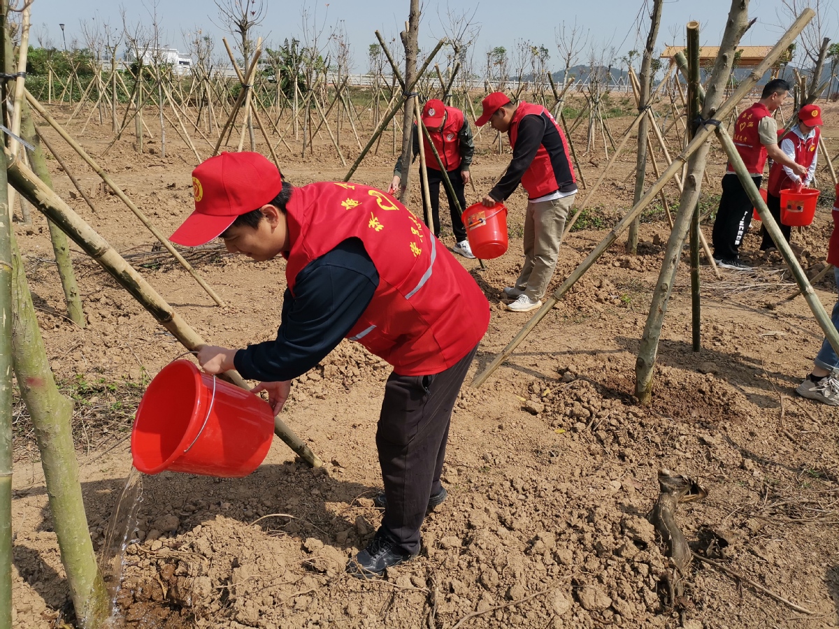 在活动现场,志愿者们提着水桶,手拿水瓢,在水车旁边接水,然后提到新种的树苗前,为树苗浇水,用实际行动共同植绿、护绿。现场处处都是忙碌的身影,呈现出一派热火朝天的劳动景象。