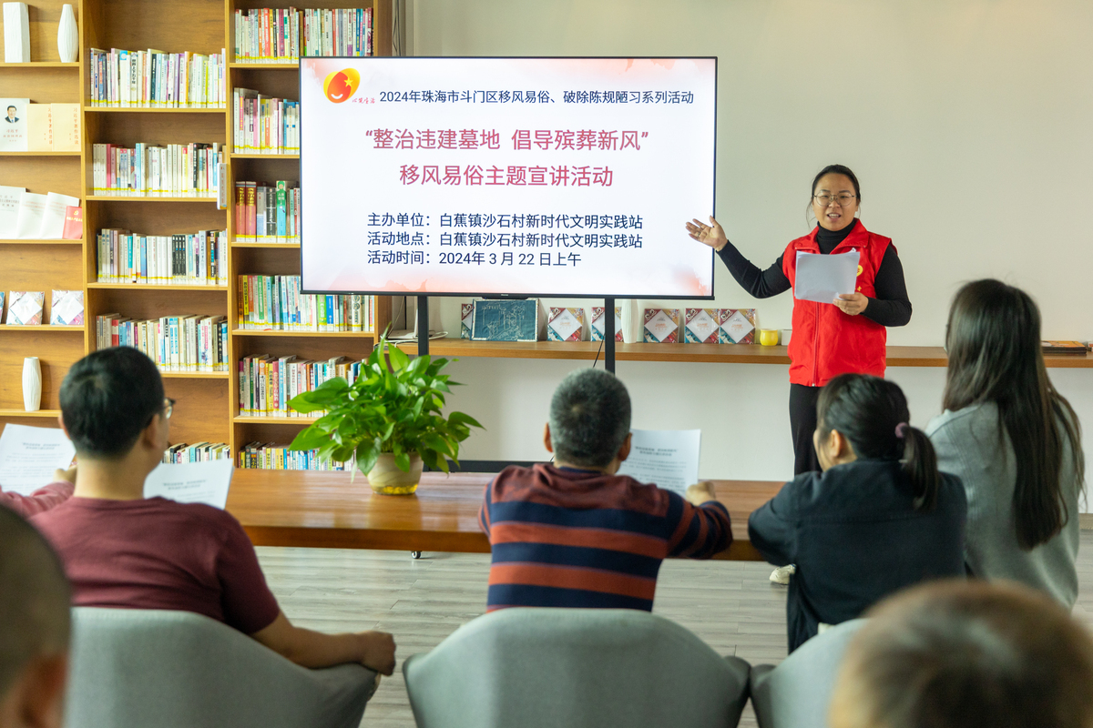 为进一步深化移风易俗,推进民俗风俗文明化、规范化,革除丧葬陋习,倡导绿色殡葬、文明殡葬,切实做好违法违规私建坟墓整治工作,促进社会文明和谐,3月22日,白蕉镇沙石村新时代文明实践站开展“整治违建墓地 倡导殡葬新风”移风易俗主题宣讲活动,活动吸引14名村民参加。