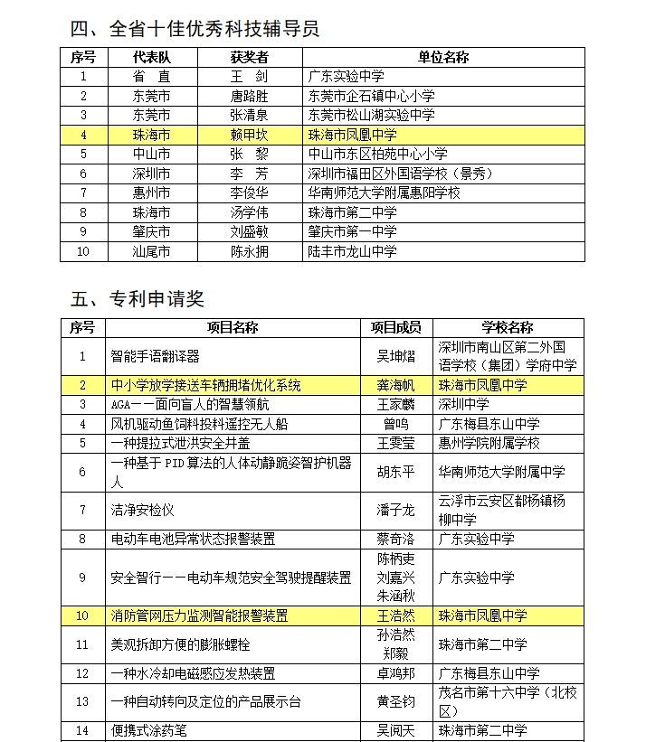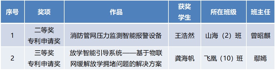 大赛对终评展示作品评出一、二、三等奖和专项奖,凤凰中学山海(2)班王浩然发明创造类作品《消防管网压力监测智能报警设备》获得二等奖、专利申请奖;飞凰(10)班龚海帆发明创造类作品《放学智能引导系统—基于物联网缓解放学拥堵问题的解决方案》获得三等奖、专利申请奖。