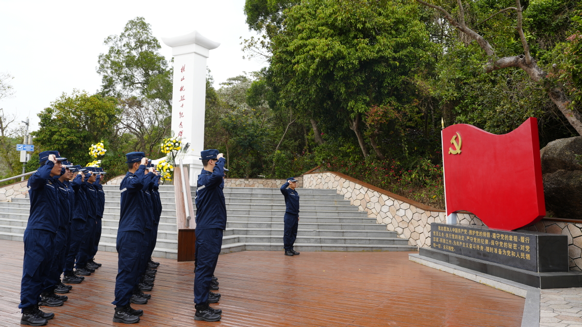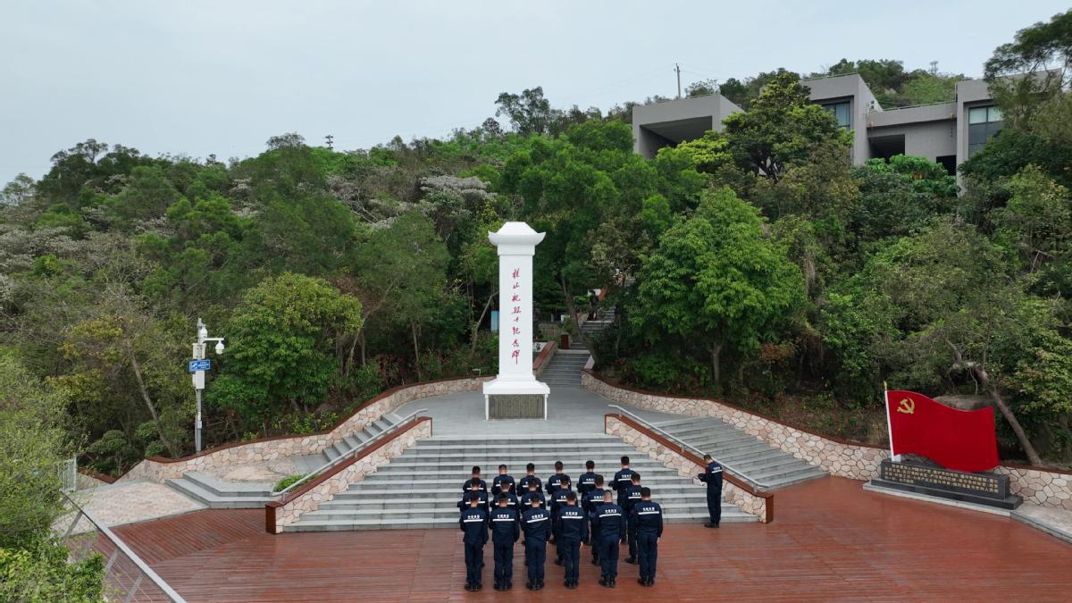 烈士碑前诉忠诚,党旗宣誓表决心。在桂山岛万山海战遗址,执法员们认真聆听了讲解员对万山海战的讲解,重温了革命先烈英勇事迹。在桂山舰革命英雄烈士纪念碑前,执法员献上手中的鲜花表达对革命先烈的崇高敬意。党旗下,执法员举起右手,重温入党誓词,以铿锵有力的誓言表达传承革命先烈精神、守卫海疆安宁的坚定意志和决心。