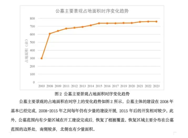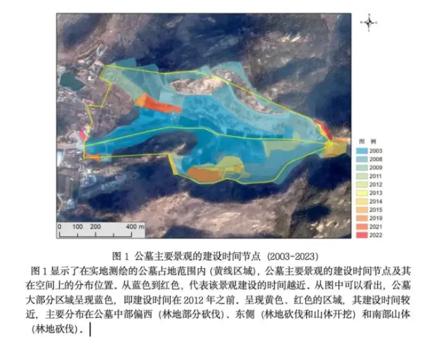 2003年以来的历年影像图片显示,近十余年来,整个太平陵公墓区域侵占林地和破坏植被较为严重的有两处,一是公墓南部山头的砍伐,破坏面积47亩左右;二是公墓东部区域的山体破坏和砍伐,最近在2022年仍有植被破坏现象,破坏面积22亩左右。