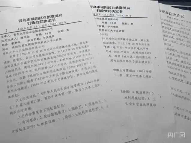 据青岛市行政处罚与行政强制信息公示平台显示,2023年11月、12月,城阳区自然资源局向太平陵公墓运营方青岛太平山公益服务有限公司开出3份罚单,共计罚款900多万元。其中一份罚单明确其涉嫌违法使用林地建设墓地,两份罚单涉及非法圈占华阴社区集体土地建太平陵公墓。实际上,在2017年,太平山公司因非法占用土地已被罚85万多元。