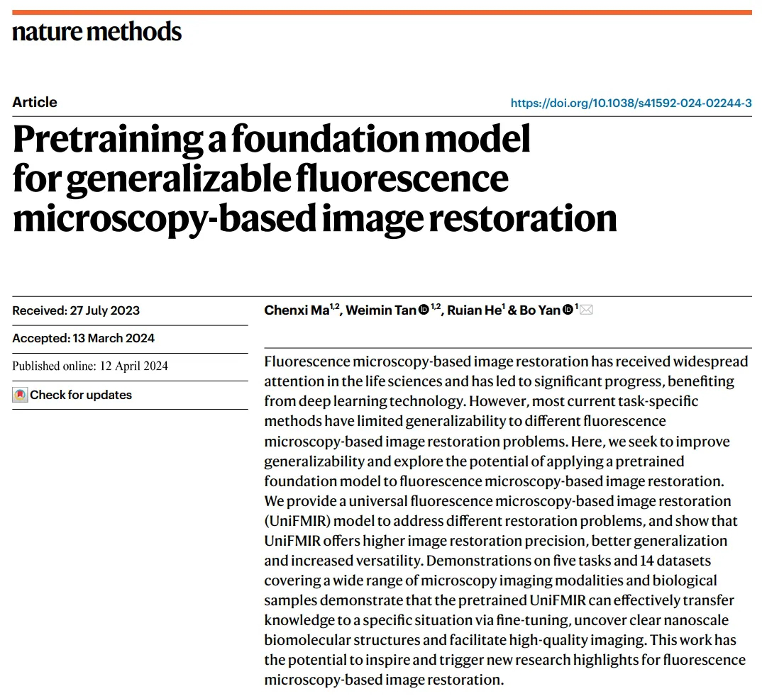 4月13日,记者从复旦大学获悉,该校计算机科学技术学院教授颜波带领的团队的研究成果发布在科学期刊《自然-方法》(Nature Methods)上。他们发明的跨任务、多维度图像增强基础AI模型(UniFMIR),实现了对现有荧光显微成像极限的突破。