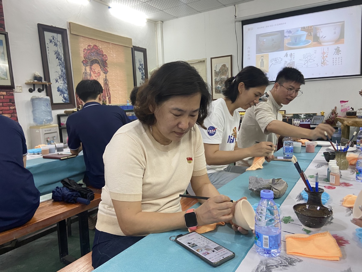 随后,在陶艺老师的带领下,党员们手捧素胚,为陶杯添上荷花、菊花、竹子等象征廉洁的元素,手绘“莲与廉”之美,把“廉洁自律”画在杯上、印在心里。不一会儿,一个个构思新颖、创意灵动的“清廉杯”在大家的手中诞生。后期,经过上釉、烧制等工序,党员们就可以使用各自的“清廉杯”饮水“思廉”了。
