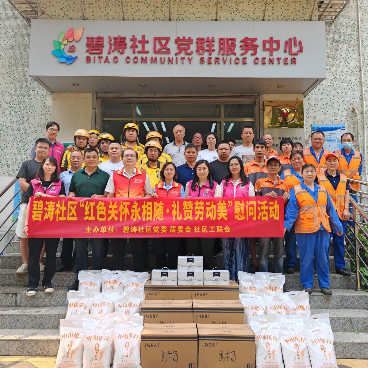 活动现场还设置了为新业态从业人员提供贴心服务的公益集市,让他们感受到来自“家”的温暖。另据了解,“五一”国际劳动节来临之际,为了让辖区环卫工人、新业态工作人员感受到节日氛围,4月29日,香洲区香湾街道碧涛社区联合辖区爱心企业开展“红色关怀永相随·礼赞劳动美”爱心慰问活动,将大米和牛奶等慰问品送到环卫工人、外卖骑手和快递员手中,叮嘱他们在工作时要注意交通安全和身心健康。