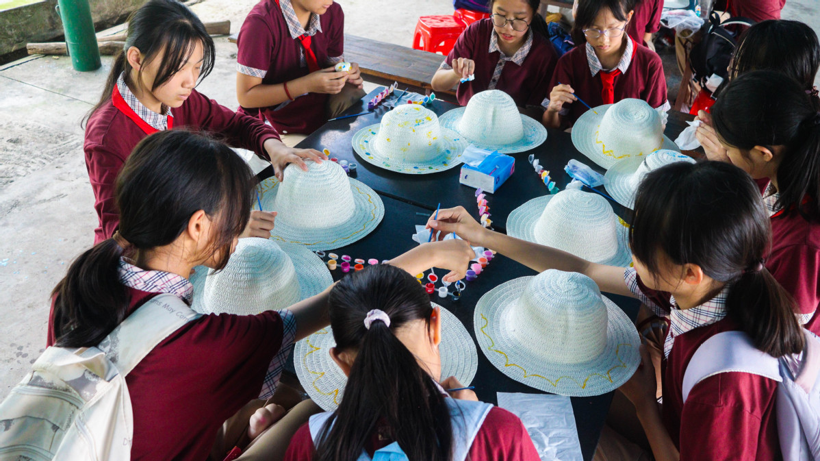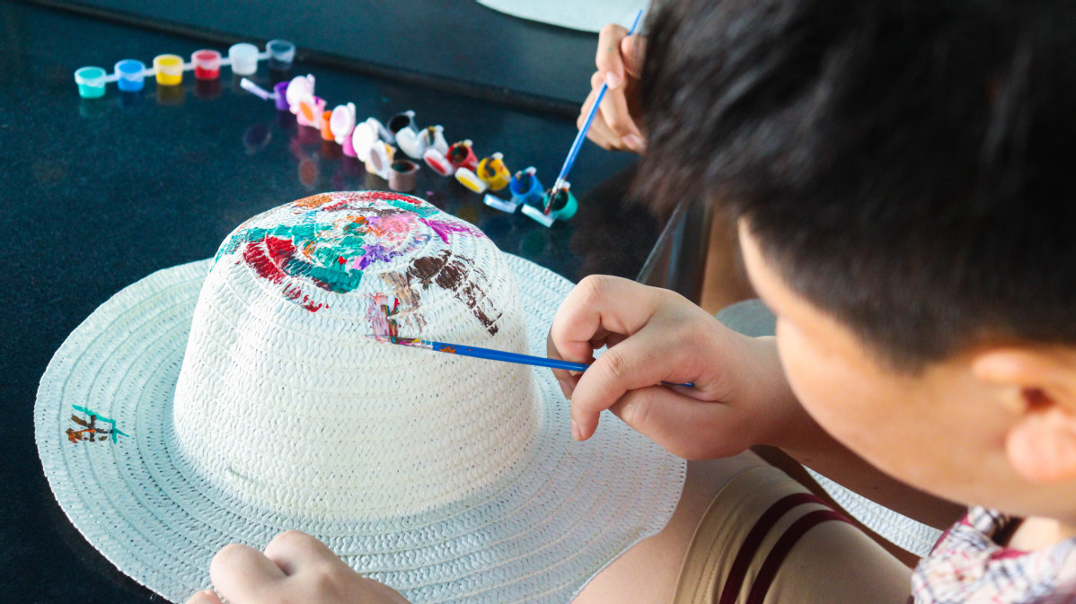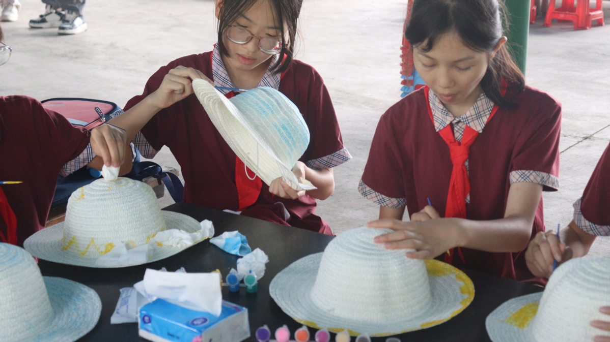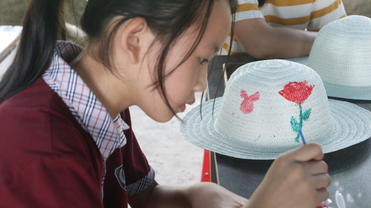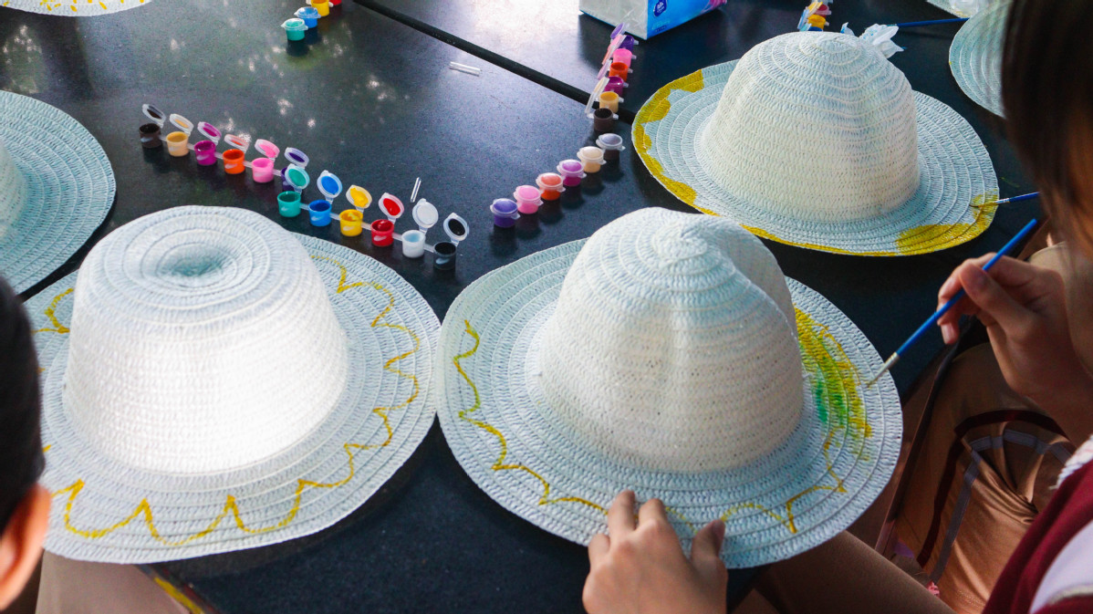 朴素的草帽在孩子们的画笔下变得五彩斑斓,同学们不不仅在草帽涂上了颜色,更是描绘了自己纯洁的童心。