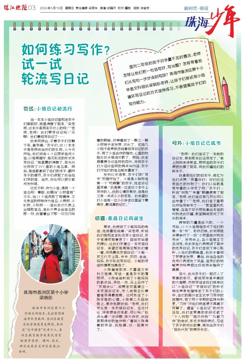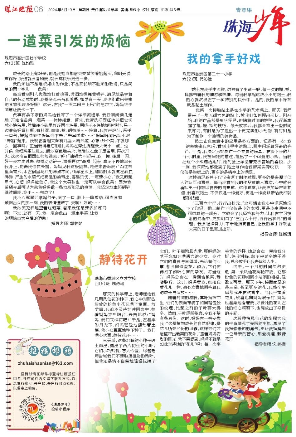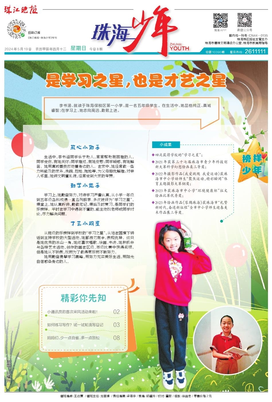 《珠海少年》是一份以孩子视角看世界的新闻纸,让小读者变身小记者;这里有一片让孩子爱上写作的文学天地;这里还是一个活跃思维、展示才艺的共乐园。《珠海少年》每周在珠江晚报出版,每期刊发8个版。