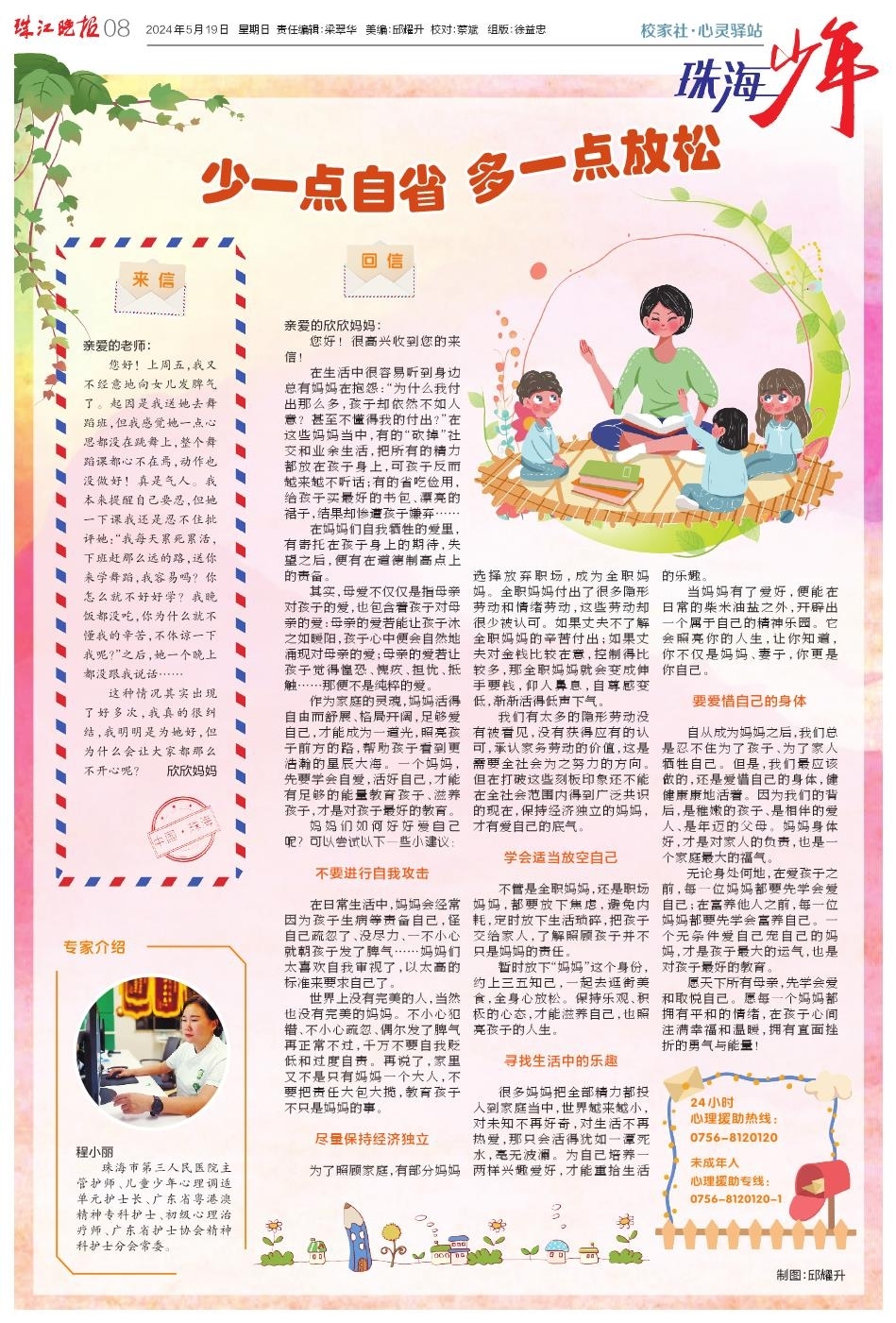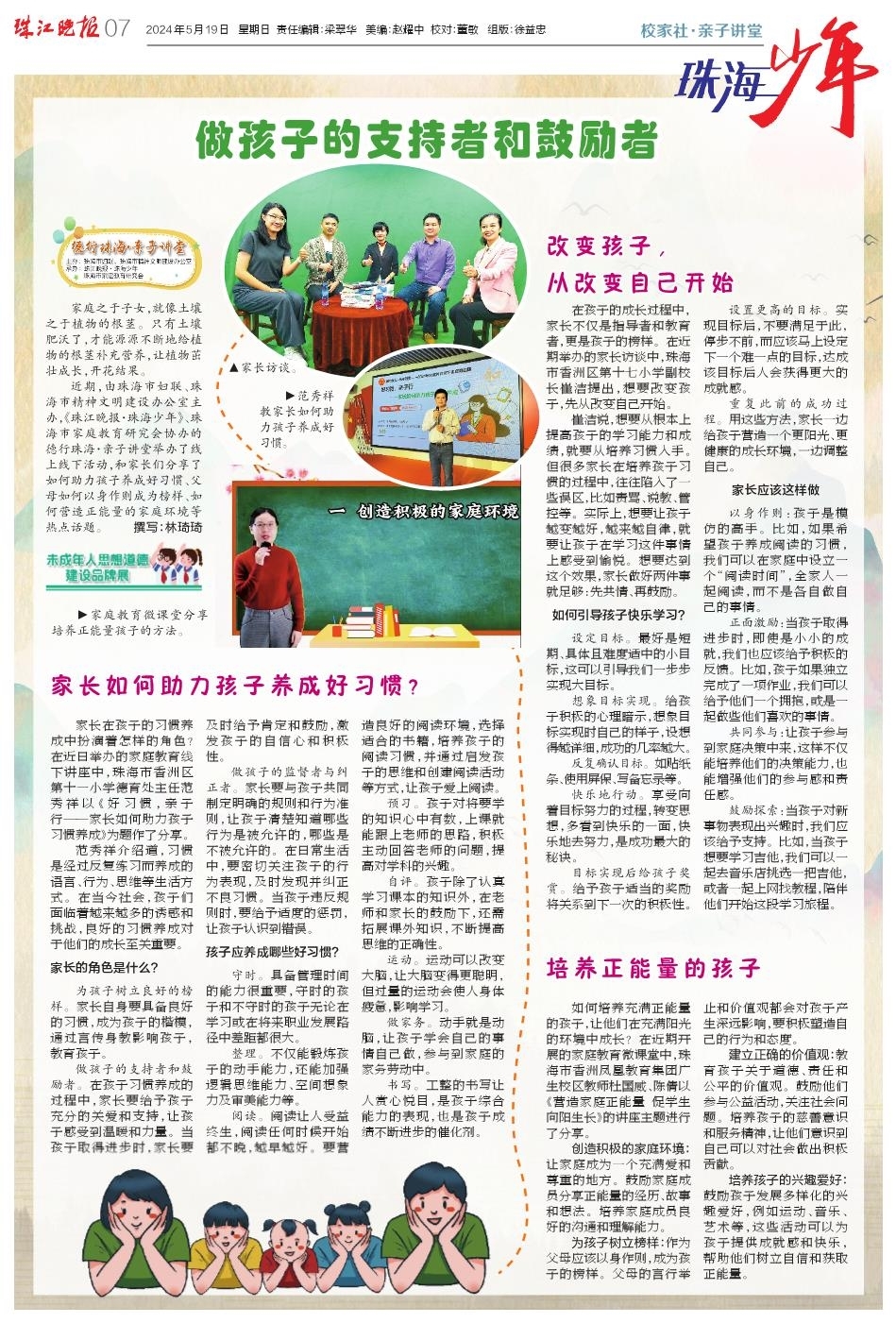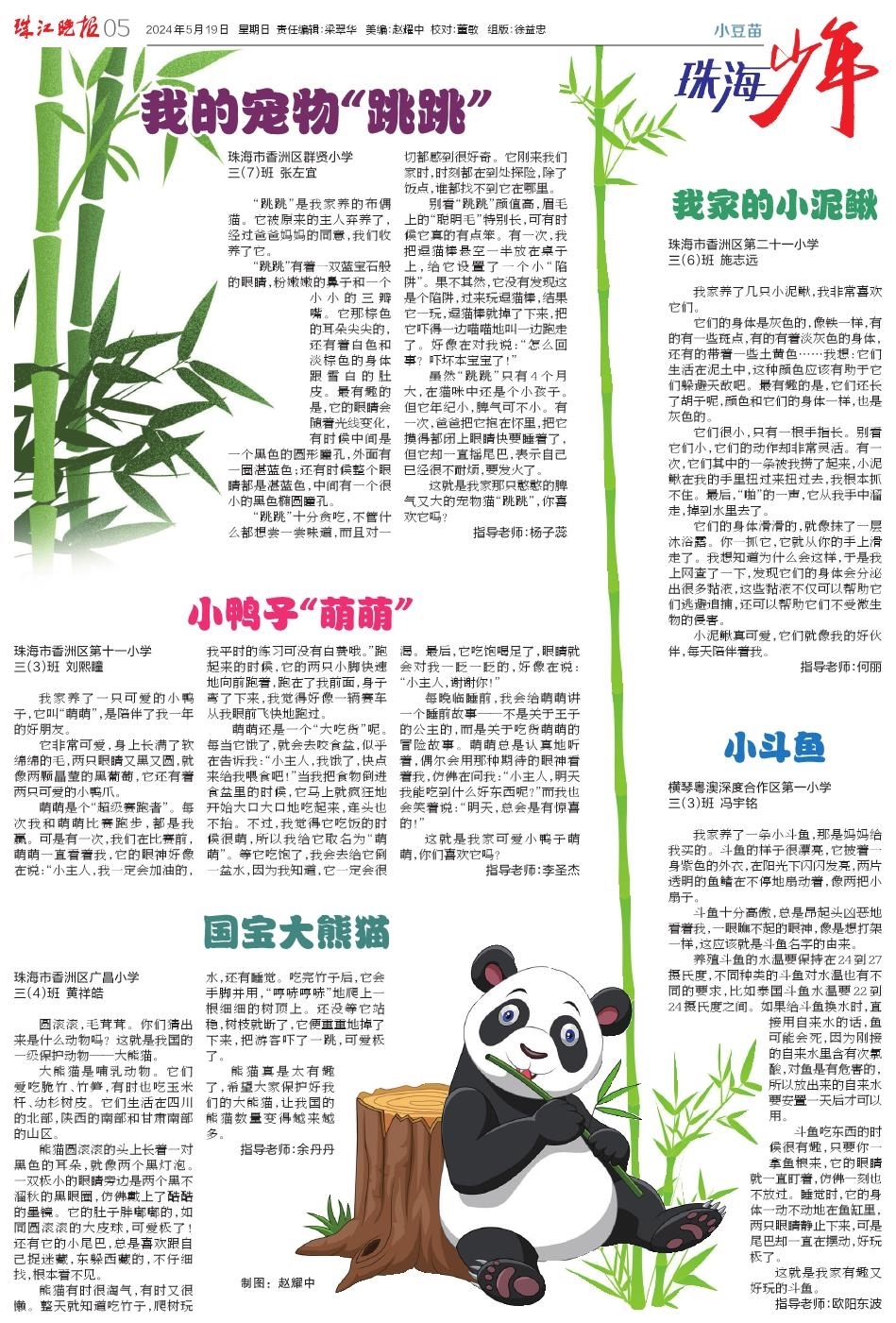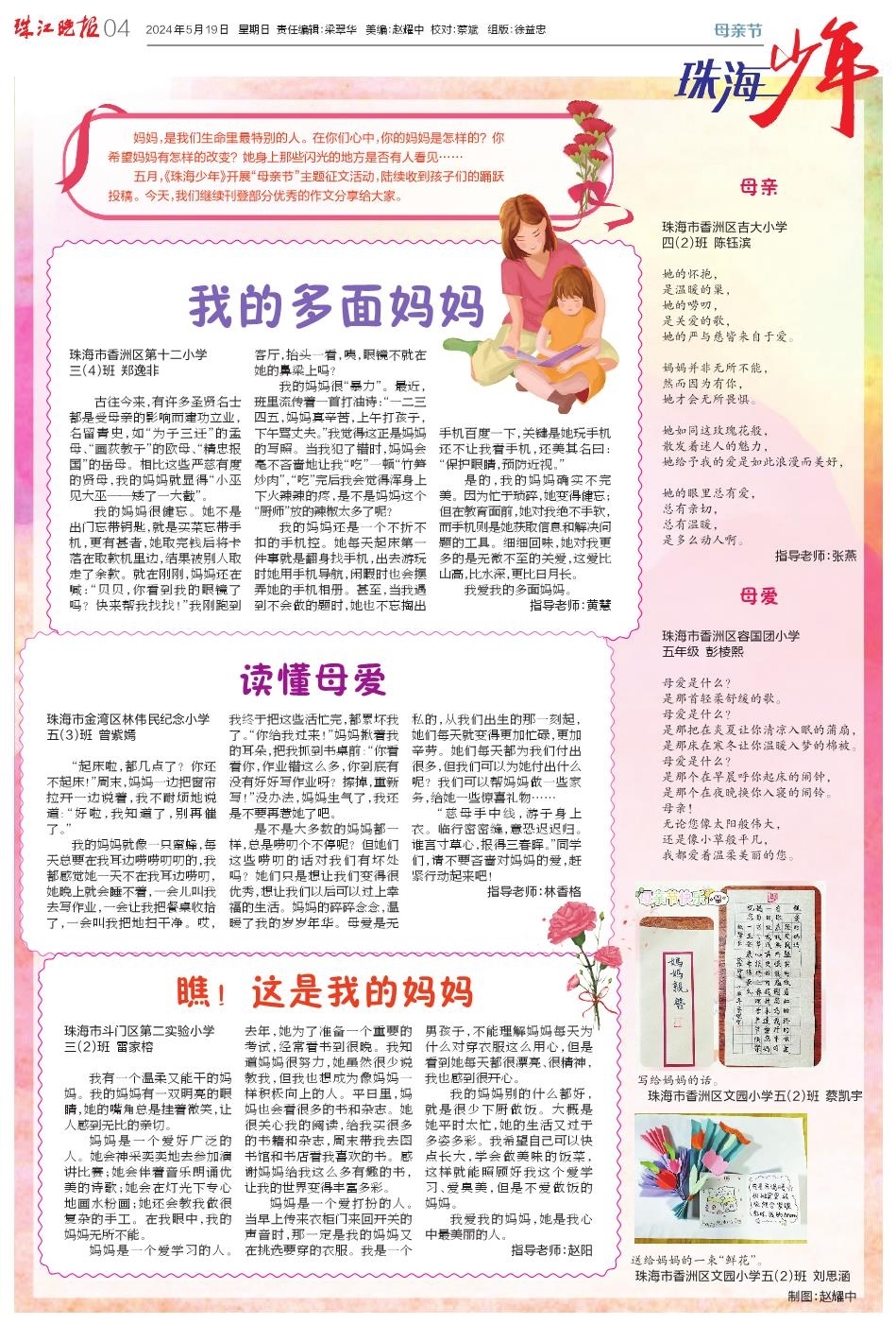 《珠海少年》是一份以孩子视角看世界的新闻纸,让小读者变身小记者;这里有一片让孩子爱上写作的文学天地;这里还是一个活跃思维、展示才艺的共乐园。《珠海少年》每周在珠江晚报出版,每期刊发8个版。