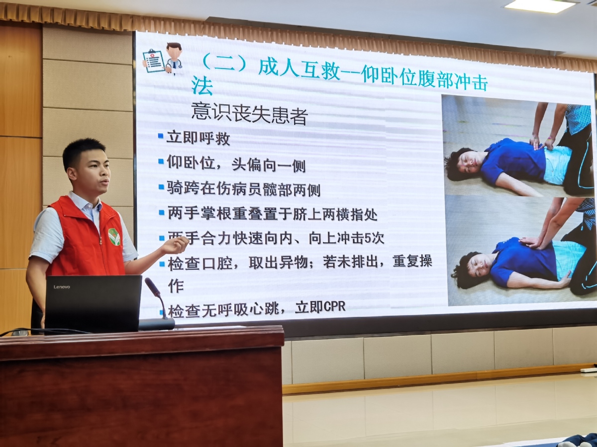 活动现场,来自省中医院斗门医院的讲师详细讲解了海姆立克法、心肺复苏术的操作步骤,急救过程中注意的事项,用互动的方式向大家传授如何最有效地利用“黄金救命时间”,应对心脏骤停、气道堵塞等突发疾病,让干部职工掌握正确的急救技能。
