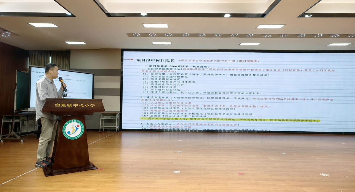 近日,斗门区政务服务和数据管理局联合斗门区教育局在白蕉镇中心小学举办全区教育系统信息化项目报审培训会,进一步规范教育系统信息化项目报审流程,提高报审效率。