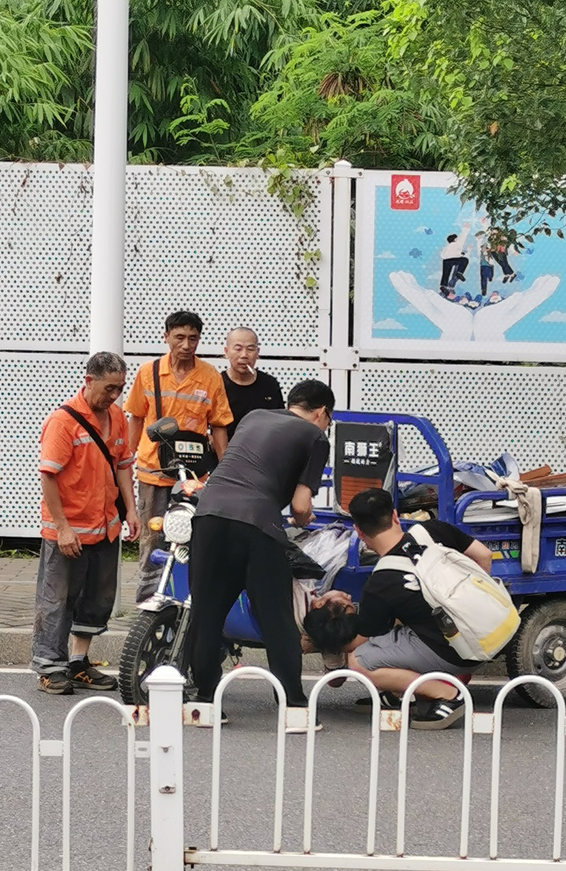 三轮车司机为50岁左右男子,是附近社区废品收购人员,此时已牙关紧锁,不省人事。众人相互配合将车推到路边,你护头、我抬脚,将该男子转移到安全平地处,随后拨打120,将他送院救治。