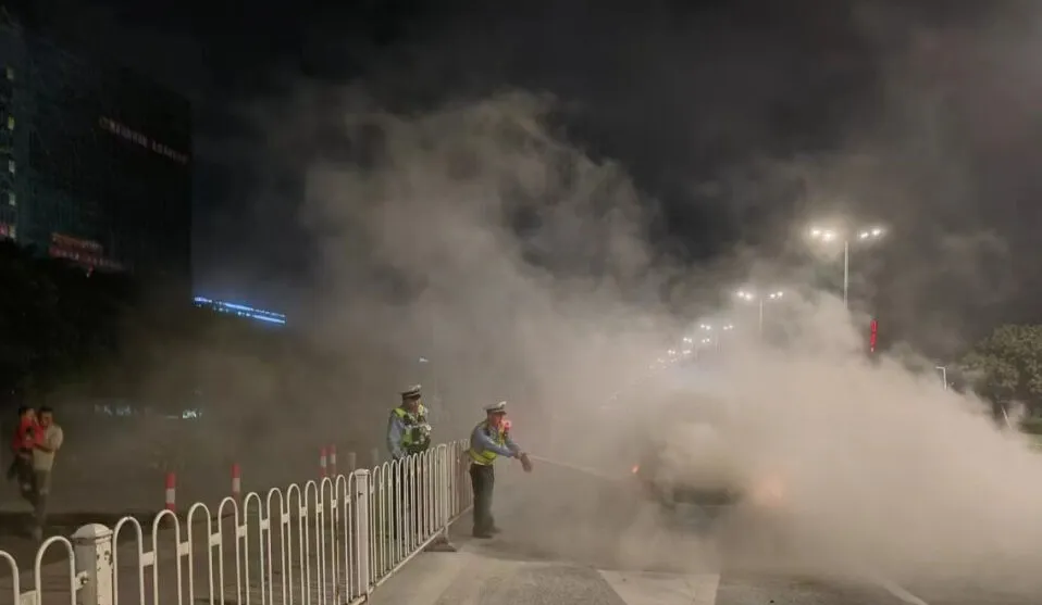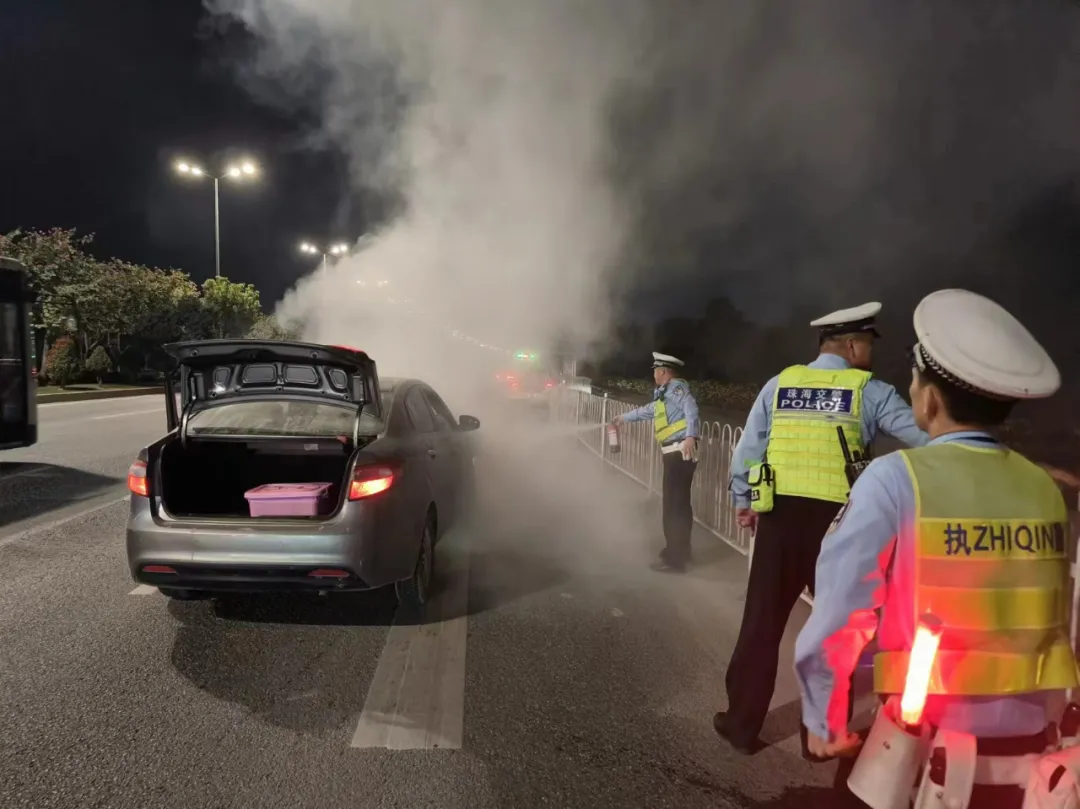 此时,交通协管员陈伟杰察觉到该车辆的异常状况,立即指挥陈先生靠边停车。陈先生停好车抱孩子下车后,陈伟杰从执勤车上拿了两瓶灭火器就跑去灭火,周边的同事看到后,也赶紧过来帮忙疏导过往车辆远离危险区域。