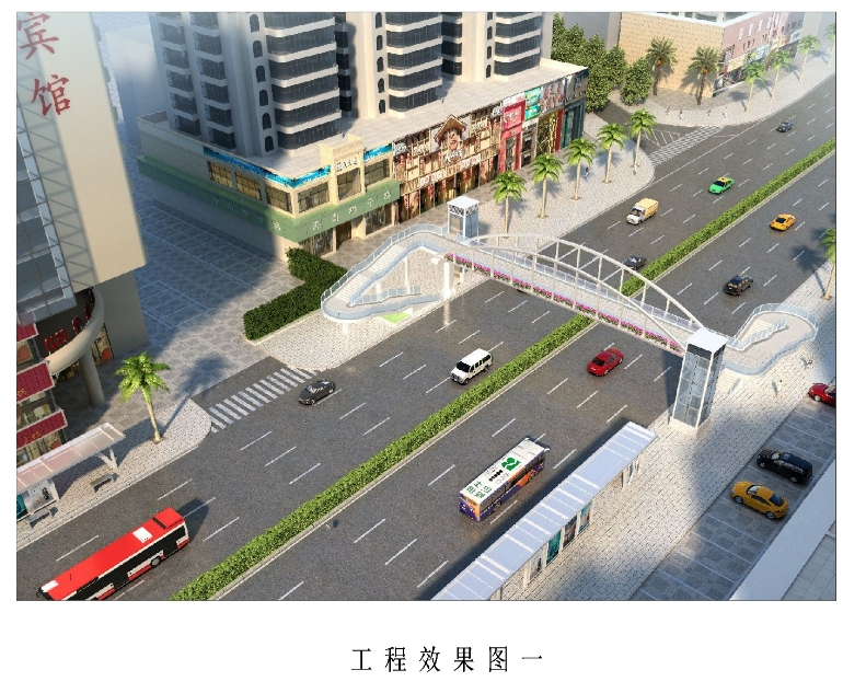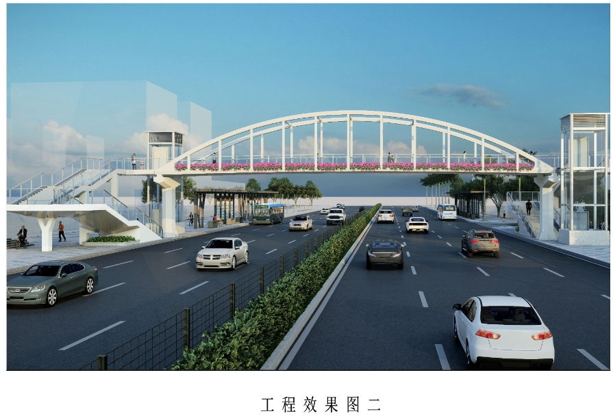 建设项目简介:该天桥为下承式拱桥,天桥长49.4m,总宽5.4m,净宽4m。天桥两侧梯道为单边折返梯道,梯道总宽3.6m,两侧各设一部无障碍垂直电梯。天桥建成后将取消地面斑马线,并设置隔离护栏。