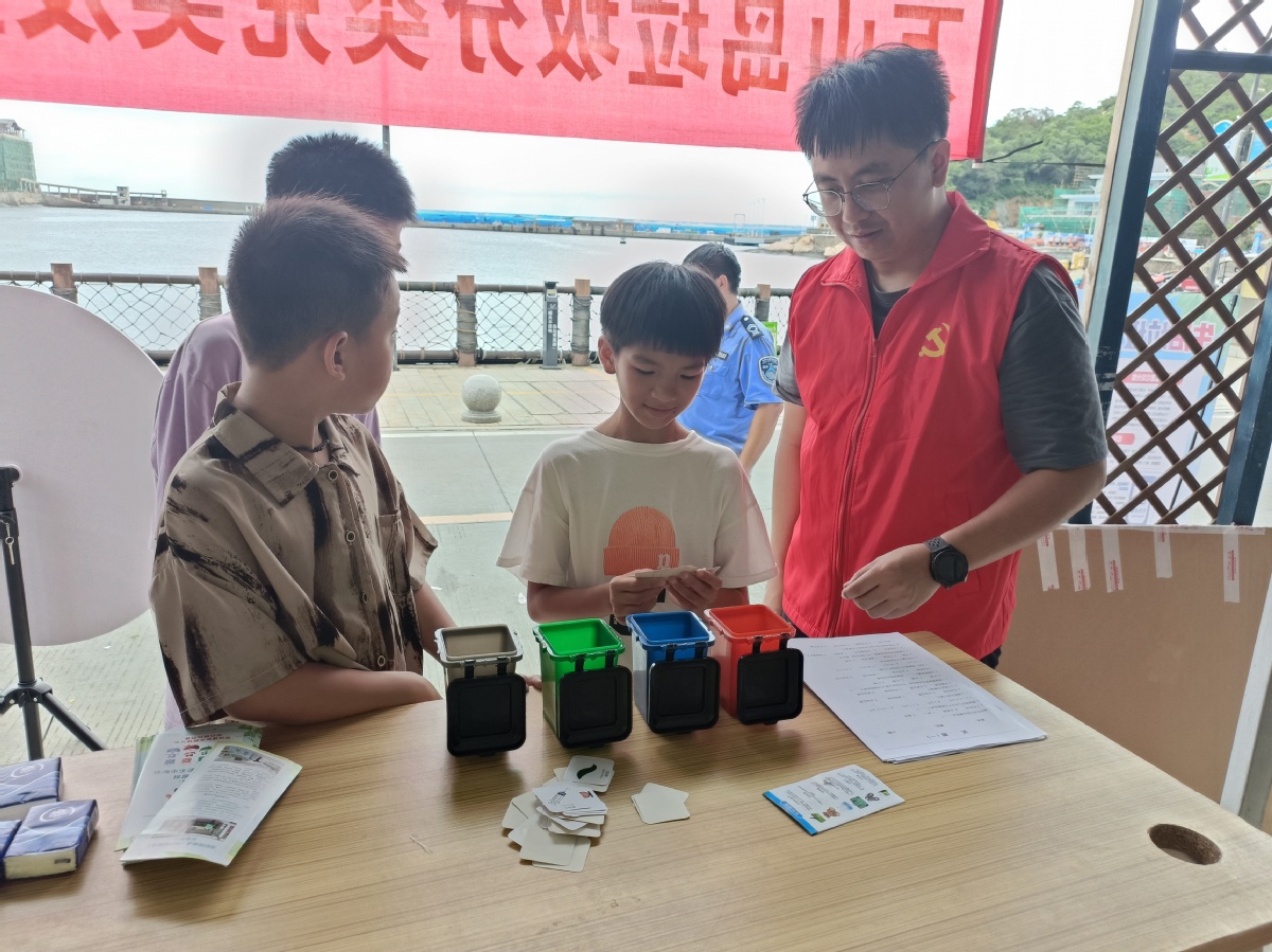 “厨余垃圾是指生活中产生的可生物降解的有机废弃物”“垃圾被随意倾倒乱扔容易导致水源和土地受到污染”……在活动现场,志愿者一边派发宣传资料,一边向海岛居民、游客讲解垃圾分类及食品安全有关知识,同时邀请居民、游客参加有奖知识问答。