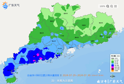 29-30日,粤西和珠江三角洲中南部市县阴天,有大到暴雨,局部大暴雨,其余市县多云到阴天,有(雷)阵雨局部大雨。