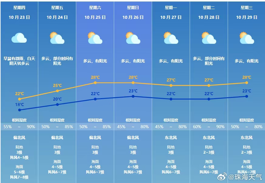 珠海七天天气预报:预计23日,珠海市阴天转多云,早晨有零星小雨;24日起阳光增多,气温逐渐回升。今晚至明天珠海市沿岸、桥面及海面风力较大,需注意做好防风工作;天气较凉,注意适时添衣。
