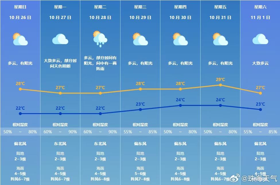 广东省气象台预计,10月26日—27日,粤东市县多云间阴天,其余大部分市县多云间晴。10月28日,雷州半岛南部多云转小雨,广东其余大部分市县多云间晴天。另受冷高压影响,10月26日—28日,粤东海面东北风6~7级阵风8级,中西部海面东北风5~6级阵风7级。