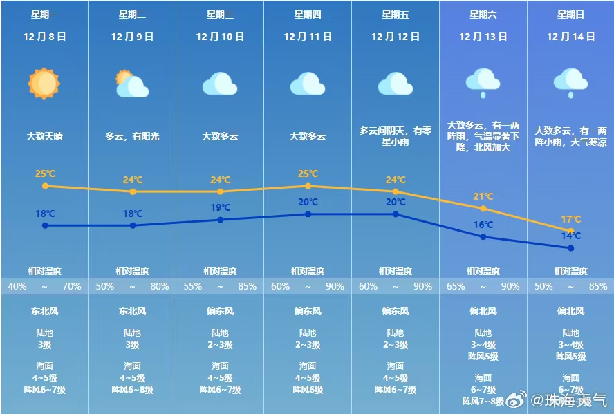 预计8日珠海市大致天晴干燥,昼夜温差大;9日多云有阳光,展望下周中期起云量增多,偶有零星小雨。温馨提示:近期天气干燥,请注意森林防火和居家用火用电安全。