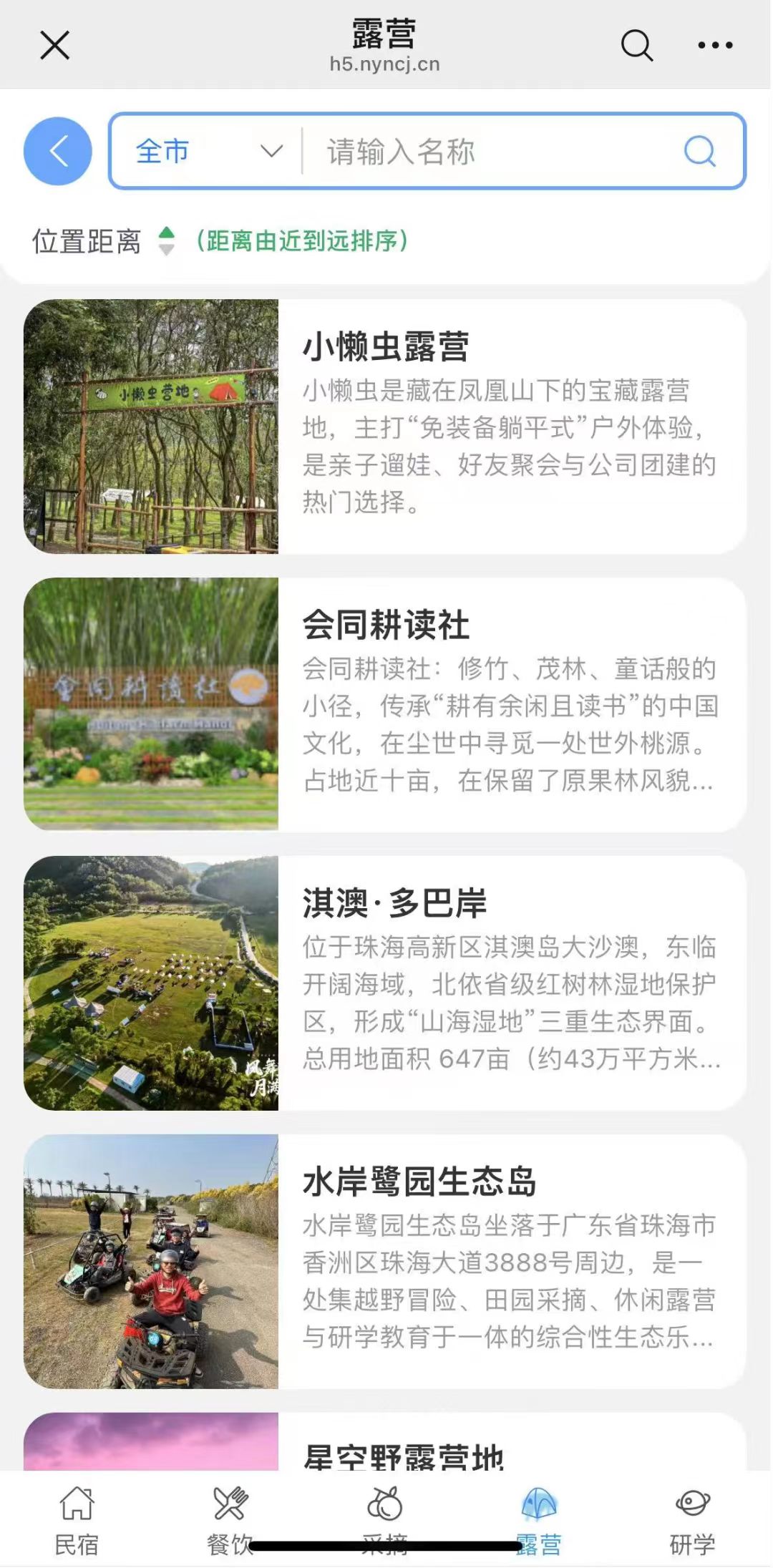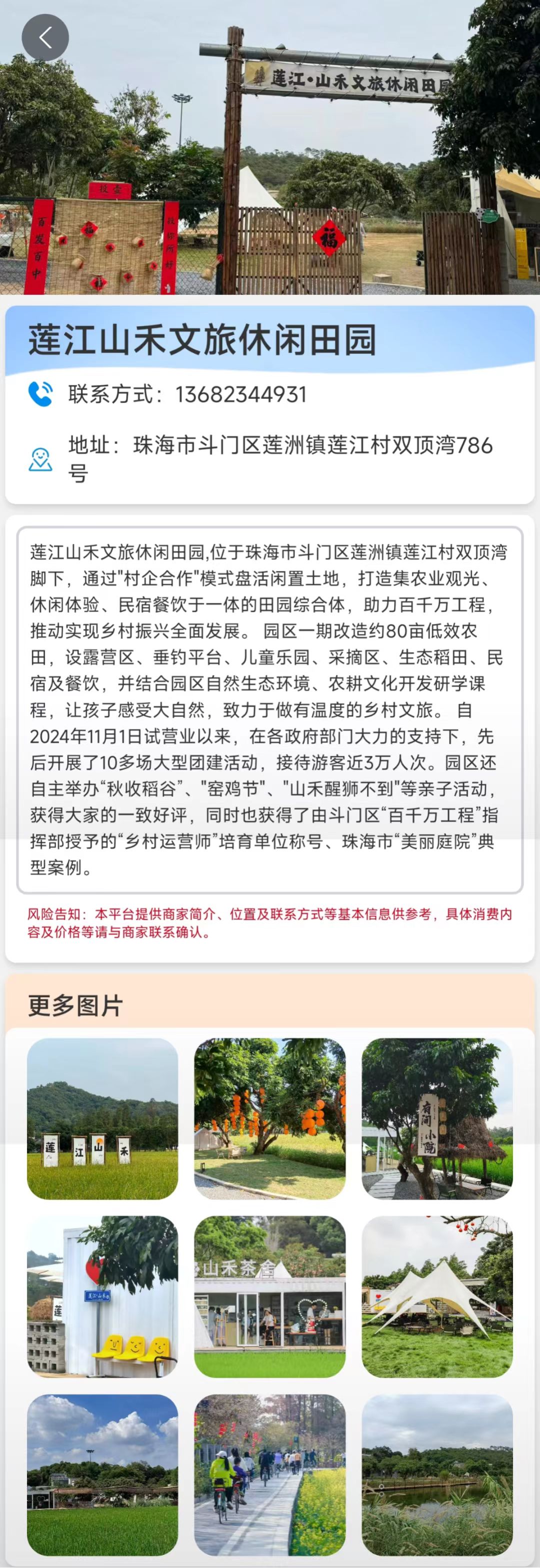 平台首页清晰设置民宿、餐饮、采摘、研学、露营五大入口,支持按区域、距离精准筛选心仪资源,每一项信息都经实地核查和专业审核,民宿的房型环境、采摘园的时令品种、研学基地的课程特色、露营地的配套设施,图文介绍一目了然。点开详情页,营业时间、联系方式、交通指引、周边配套资源全面展示,点击地址就能一键跳转主流地图导航,分类页、详情页还支持一键分享,和家人好友分享攻略超方便。