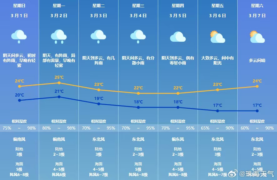 珠海七天天气预报:预计3月1日珠海市阴天间多云,早晨至上午有阵雨;2-4日受冷空气影响,间中有阵雨,并可能伴有雷暴,气温小幅下降;展望5-7日云量逐渐减少,阳光增多。
