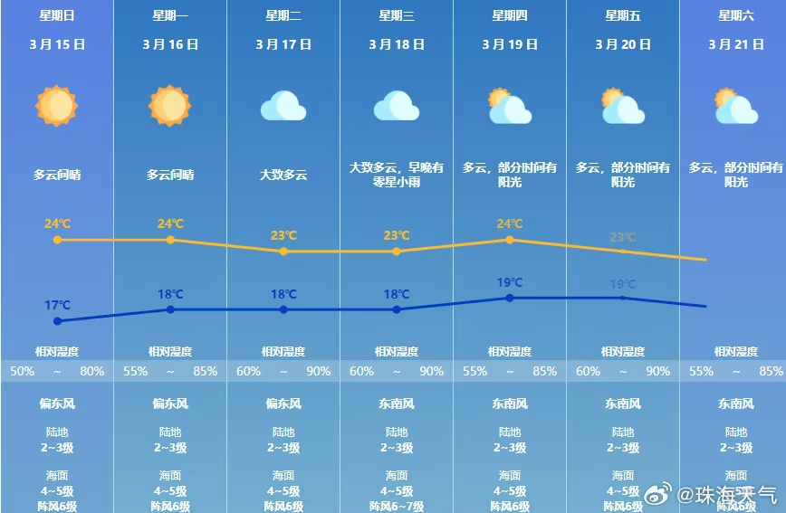 3月15-16日,西部市县多云,其余市县晴到多云。15日早晨最低气温:河源、梅州、惠州、粤东市县8℃~11℃,珠江口附近和粤西沿海市县16℃~20℃,其余大部分市县11℃~16℃。16日最低气温小幅回升。