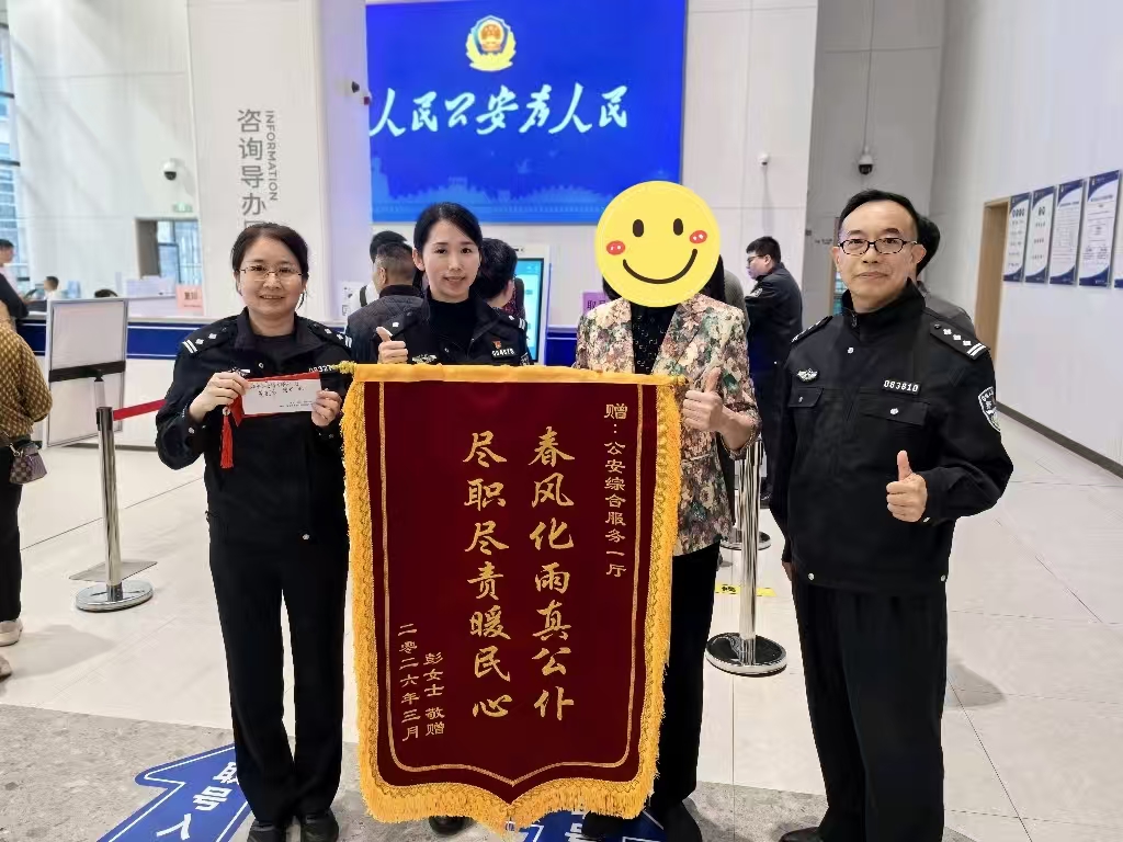 3月12日,市民彭女士专程来到公安综合服务一厅,将一面写有“春风化雨真公仆尽职尽责暖民心”的锦旗与感谢信交到工作人员手中。原来,彭女士之子因历史原因存在双重户口问题,这一困扰严重影响其生活、社保及出行。公安综合服务一厅迅速响应,立即成立由莫莉红、王永强牵头的工作专班,联合多部门协同作战。