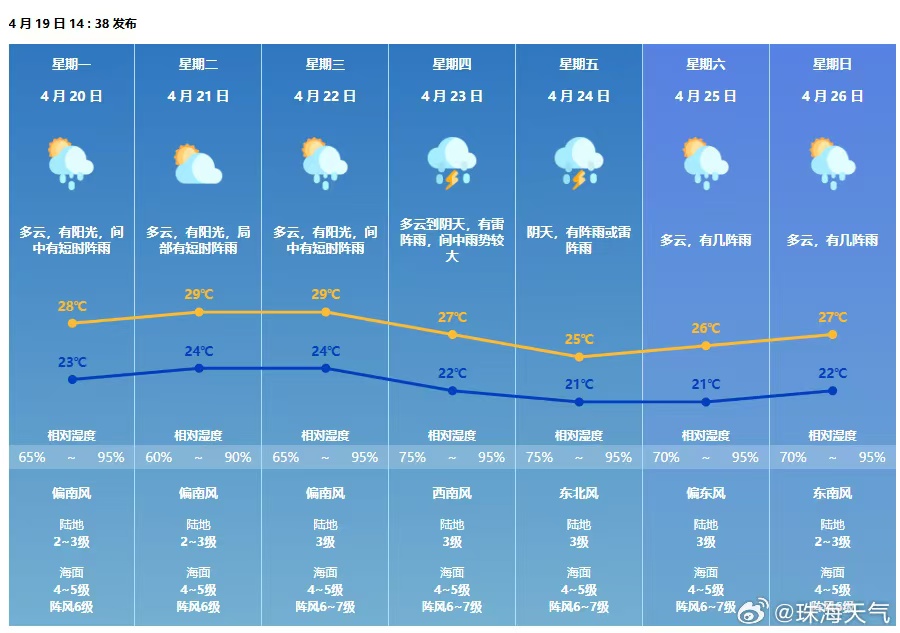 珠海七天天气预报:预计未来三天(20-22日),珠海市以多云天气为主,部分时间有阳光,间中有短时阵雨;23-24日受冷暖气流交汇影响,有雷雨,间中雨势较大。