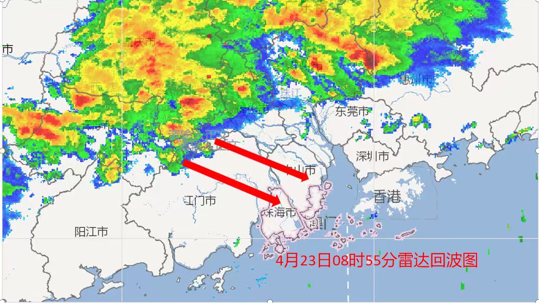 珠海市气象台4月23日8时55分发布消息,预计雷雨云团将在今天中午前后抵达珠海,珠海将自西北向东南转雷雨,间中雨势较大,并伴有8-10级短时大风。