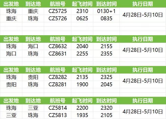 4月28日—5月8日将迎来“五一”假期客流高峰,为切实满足旅客出行需求,践行便民利民服务理念,南航旗下珠海航空公司作为珠海金湾机场唯一基地航司将加大运力投入,往返海口、重庆、贵阳、三亚作为热门航线将加密。