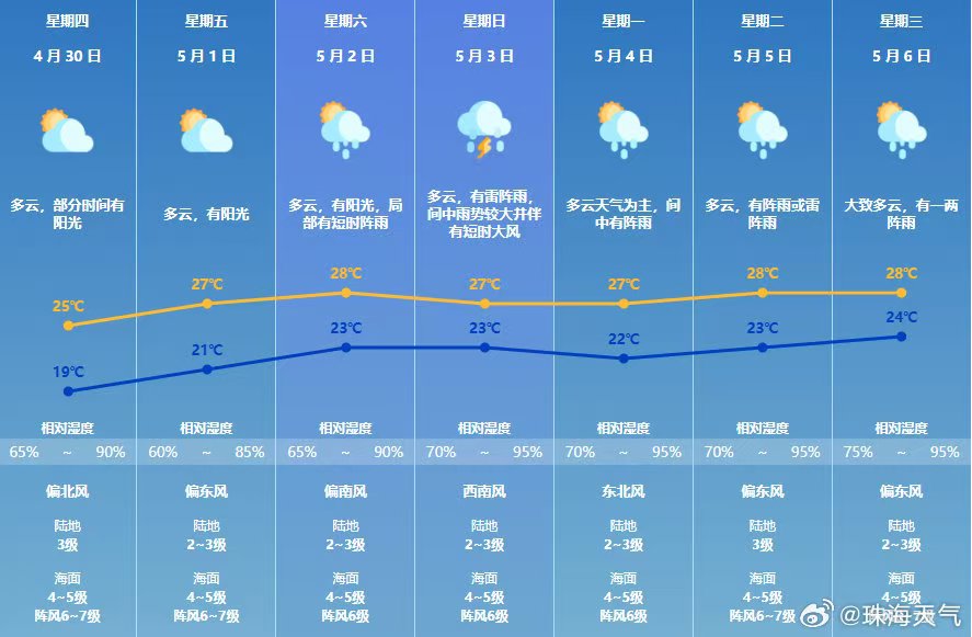 珠海七天天气预报:预计4月30日至“五一”假期前期,以多云天气为主,偶有阵雨;假期中后期天气转不稳定,雷雨趋于明显。温馨提示:近期降雨频繁,土壤含水量较高,请注意防御强降雨及其可能引发的地质灾害。