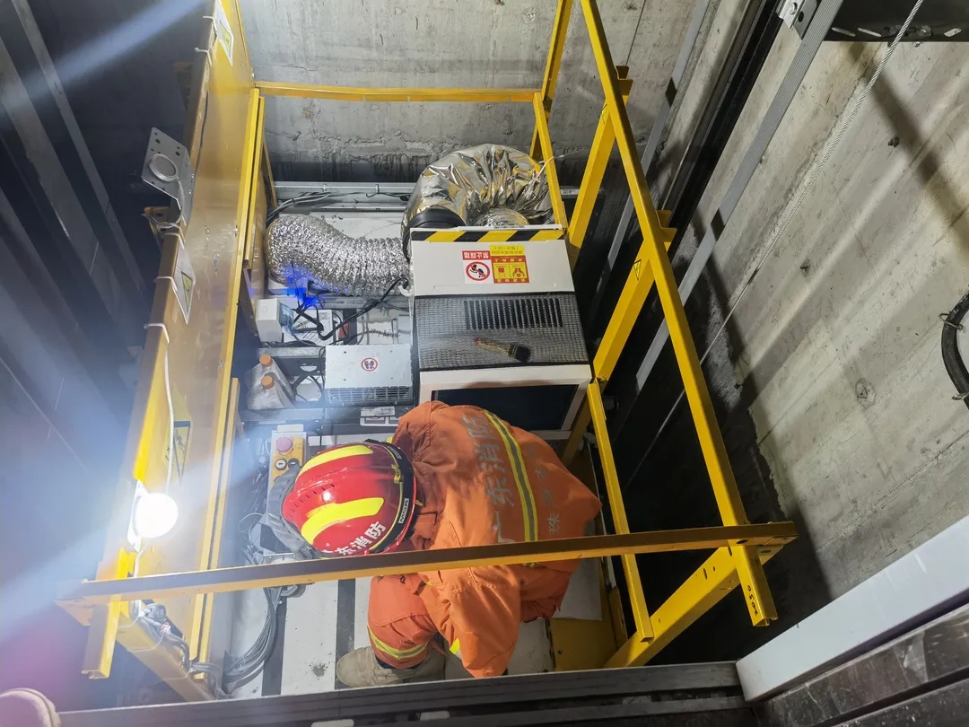 被困者为一名老年妇女,当时正处在一二层之间的位置。消防员到场后,隔着电梯门一边安慰被困人员,一边利用开锁器开门。但内层电梯门已经锁死,硬开则会破坏电梯结构。此时,电梯维保人员还未到达,为尽快救出该女子,在确保安全的情况下,消防员决定从电梯上方进行救援。