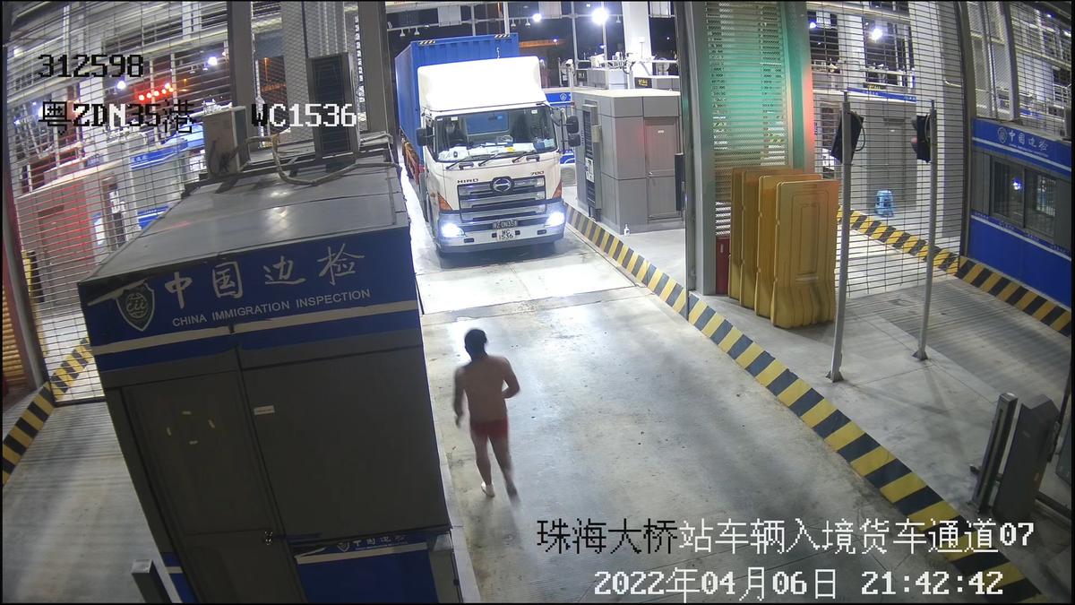 “站住,别跑!”一声呵斥打破了夜幕下的寂静。一名上身赤裸、下身仅穿着内裤的男子,以货车车体为掩体逆行闯入口岸限定区域,特勤组的移民管理警察第一时间发现并上前制止,但该男子不予理会,反而加速逃窜。执勤民警立即追赶拦截,同时呼叫支援警力。民警克服穿戴着防护服行动不便的困难,紧追不舍,在追出近600米后,最终与到达的支援警力配合,将男子制服。