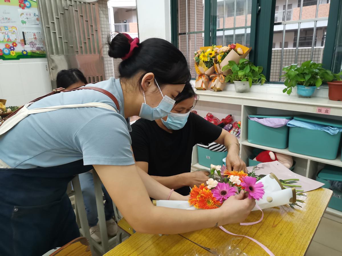20余位临险安置女工在花艺师的指导下学起了插花手艺。“真的很开心,我长这么大还没学过插花呢!这里可以吃好、喝好、睡好,还有文艺节目解闷,真的太幸福了!”女工们开心地说,一张张笑脸写满了喜悦。
