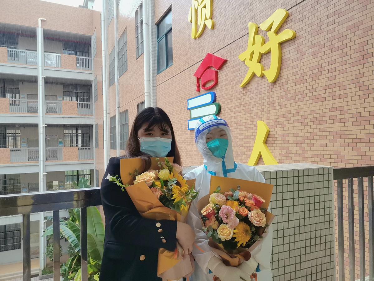 为致敬白衣天使,社区党委还向入驻庇护所的4位护士献上了鲜花。接过鲜花,年轻的护士们直呼暖心!对社区工作人员的暖心、贴心服务表示了感谢。