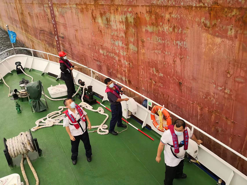 5月15日12时,万山港海事处工作人员乘坐“海巡09158”船,携带药品前往锚地,通过使用绳索、水桶等,全程快速、无接触传递药品,30分钟后,药品顺利送入患者手中。