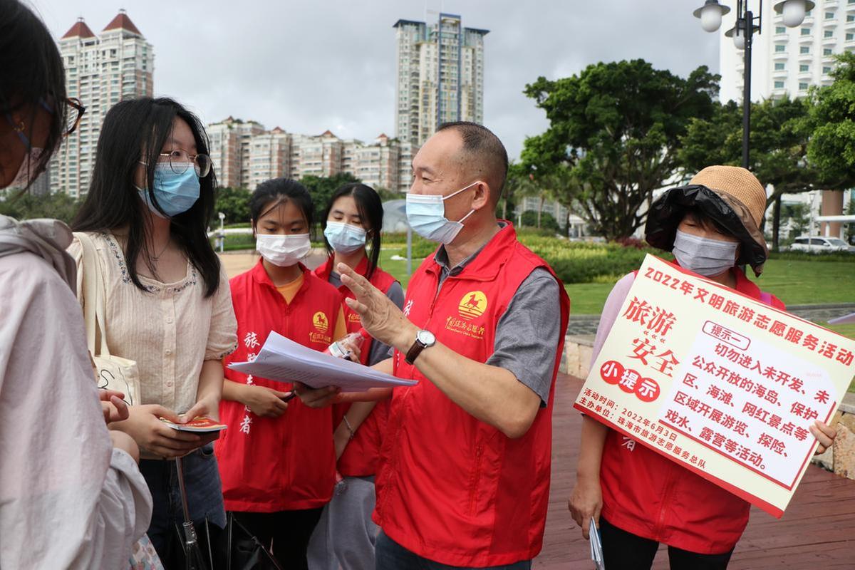 4日当天,珠海四季研学旅游志愿服务分队,在金湾平沙红旗中心广场,以“文明旅游 从我做起”和“诚信旅游”为主题开展文明旅游志愿服务。珠海经济特区圆明新园旅游有限公司志愿服务分队,值班人员每天以“疫情防控不放松”为主题,做好“防疫三件事”——戴口罩,测体温,检查粤康码、场所码、行程码,在景区入口处劝导游客保持“一米线”有序排队,开展文明旅游志愿服务。