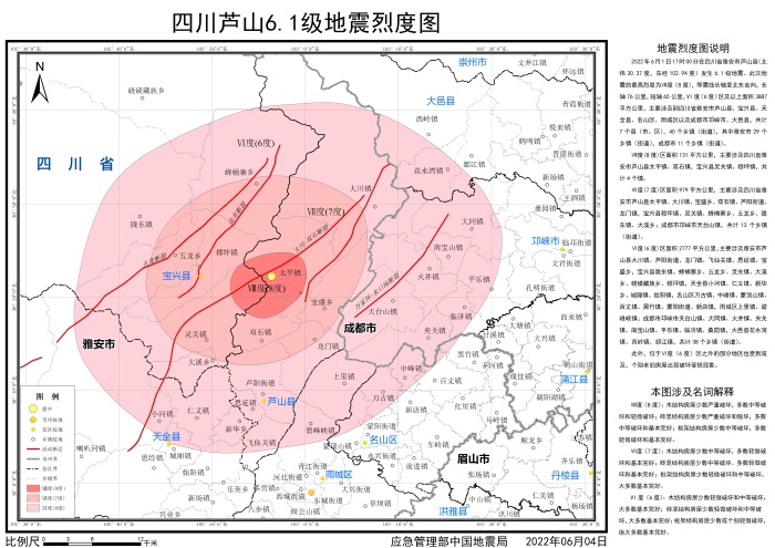 2022年6月1日17时00分,四川省雅安市芦山县(北纬30.37度,东经102.94度)发生6.1级地震,震源深度17公里。按照应急管理部部署,中国地震局组织四川省地震局及重庆、贵州2个省(市)地震局及相关直属研究所组成现场工作队,依照《地震现场工作 第3部分:调查规范》(GB/T 18208.3-2011)、《中国地震烈度表》(GB/T 17742-2020),通过灾区震害调查,并综合应用仪器烈度、地震构造背景、余震分布、震源机制、遥感影像等科技支撑成果,确定了此次地震的烈度分布,并依照《地震烈度图制图规范》(GB/T 38226-2019)编制完成《四川芦山6.1级地震烈度图》。