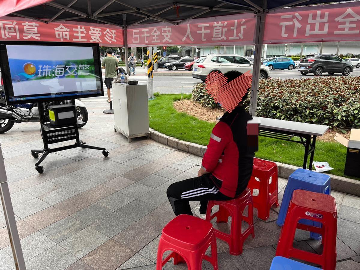 拱北街道文明交通宣教点设置了帐篷、平板电视、宣教展板等,平板电视播放着交通安全警示教育宣传片。交警在路口执勤,发现不遵守交通规则的行人,将其带到文明交通宣教点观看15分钟的交通安全警示教育宣传片,并对其进行劝诫教育。